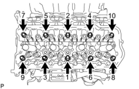CYLINDER HEAD LHUsing a 10 mm bi-hexagon wrench, install and uniformly tighten the 10 cylinder head bolts with the plate washers in several steps, in the sequence shown in the illustration.