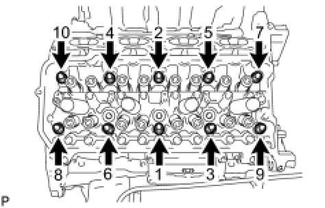 Using a 10 mm bi-hexagon wrench, install and uniformly tighten the 10 cylinder head bolts with the plate washers in several steps, in the sequence shown in the illustration.
