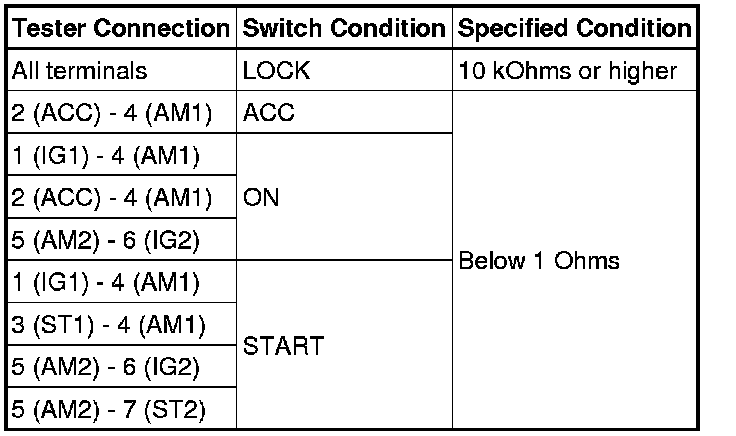 If the result is not as specified, replace the ignition or starter switch assembly.