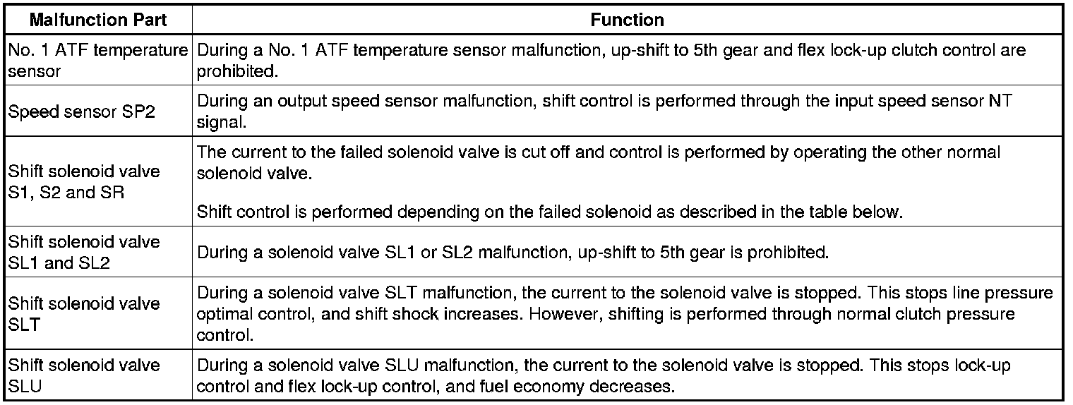 If either of the shift solenoid valve circuits has an open or short failure, the ECM turns the other shift solenoid ON and OFF in order to shift into the gear positions shown in the table below.