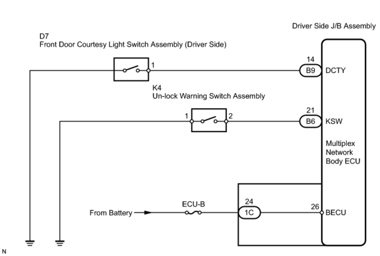 The un-lock warning switch turns ON when the key is inserted in the ignition key cylinder. The courtesy light switch turns ON when the driver side door is opened. These 2 switches are monitored by the body ECU.