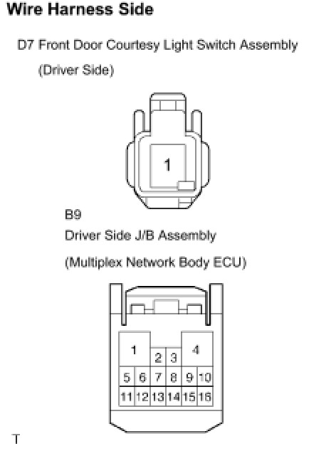 7. CHECK HARNESS AND CONNECTOR (FRONT DOOR COURTESY LIGHT SWITCH - DRIVER SIDE J/B)