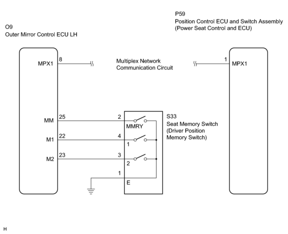 The seat memory switch sends signals to the outer mirror control ECU LH via the multiplex communication system to memorize a given seat position. This memory system does not use a position sensor. The seat position is detected by counting pulses that are output when the motor turns. If there is no pulse output from the motor, the motor will stop operating. The seat memory switch is later used to send signals to the front power seat switch to return the seat to one of the memorized positions.