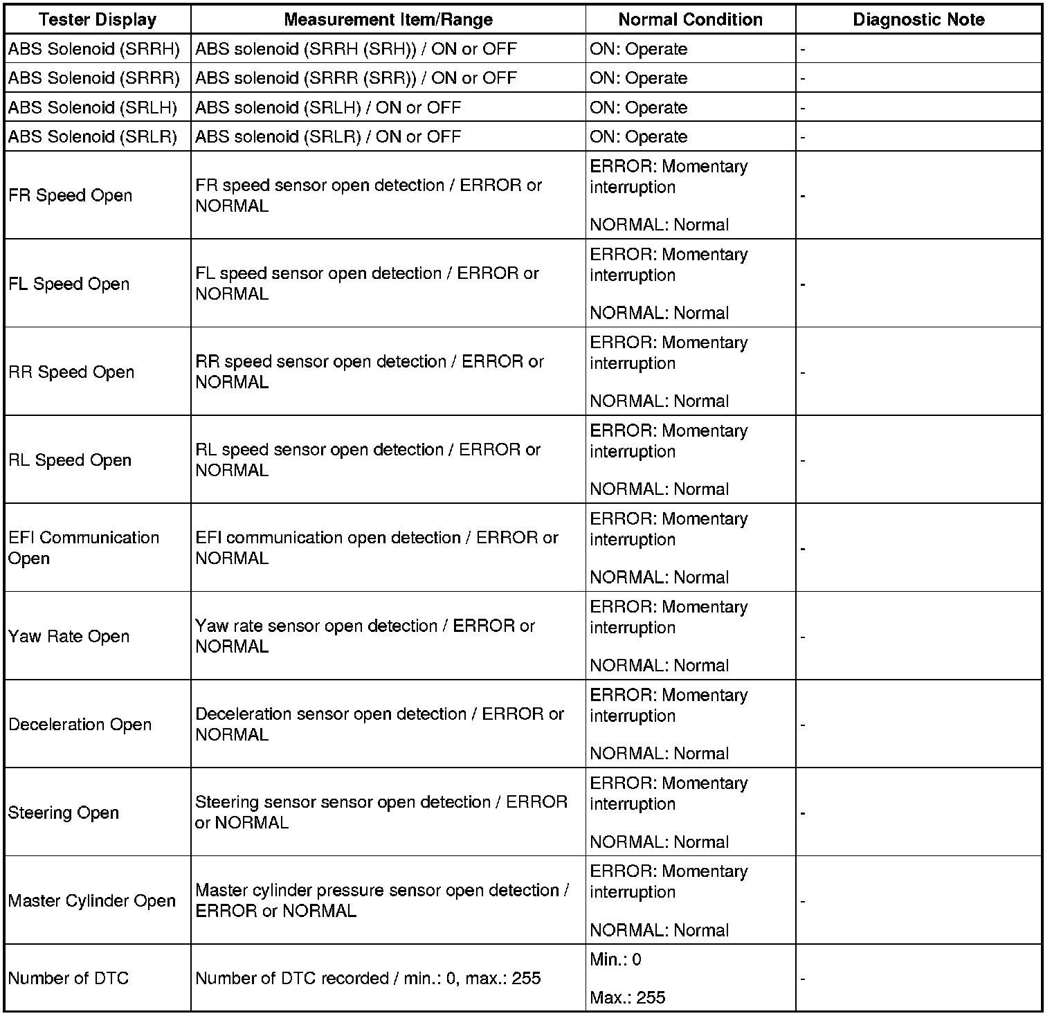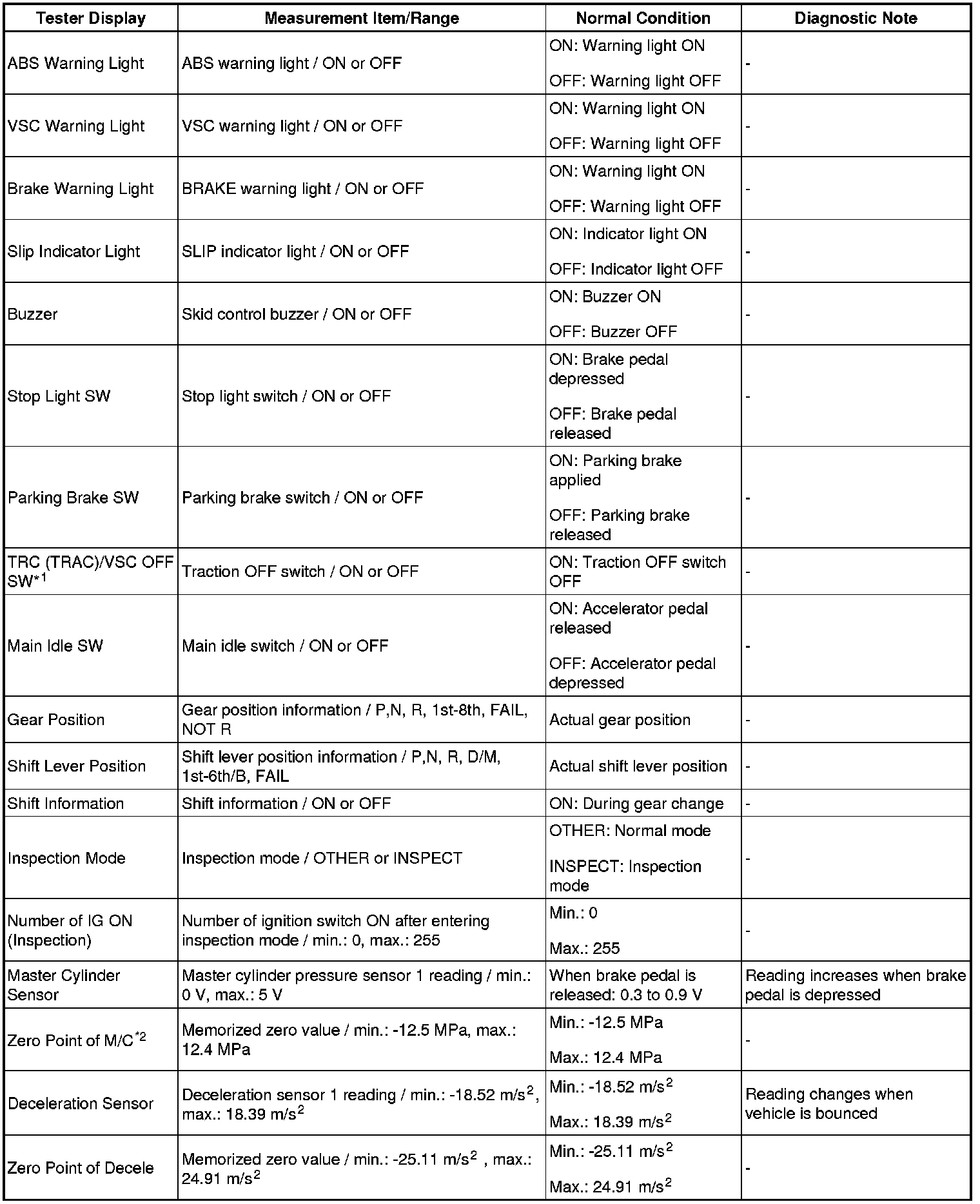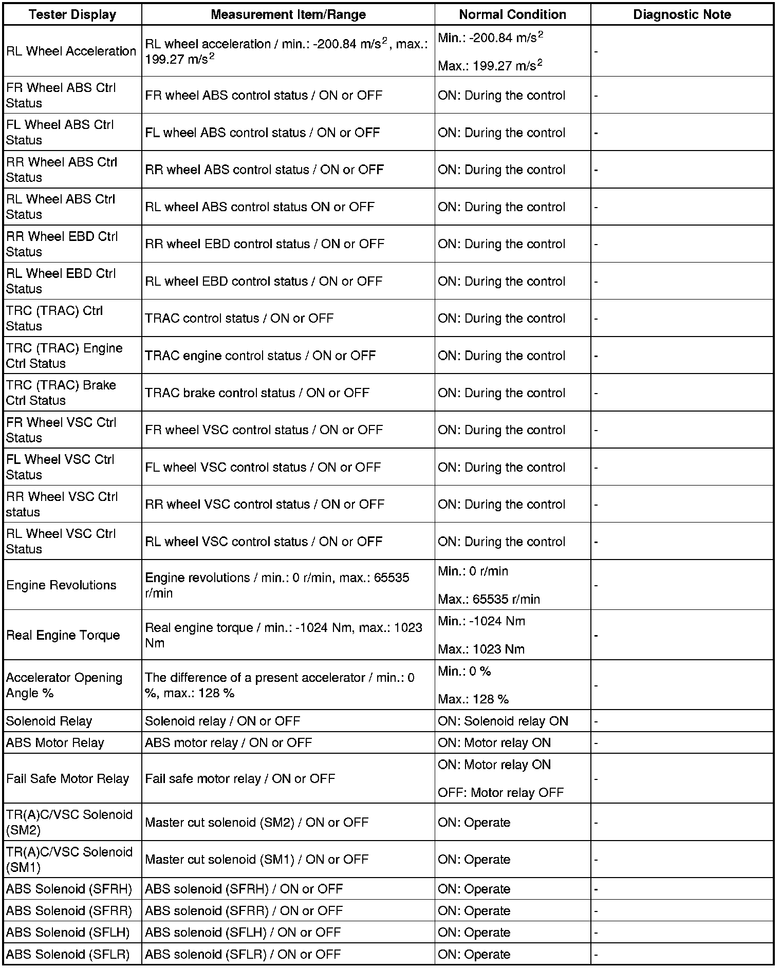 HINT: With the Techstream connected to the DLC3 and the ignition switch to the ON position, the ABS, TRAC and VSC data list can be displayed. Follow the prompts on the tester screen to access the Data List.