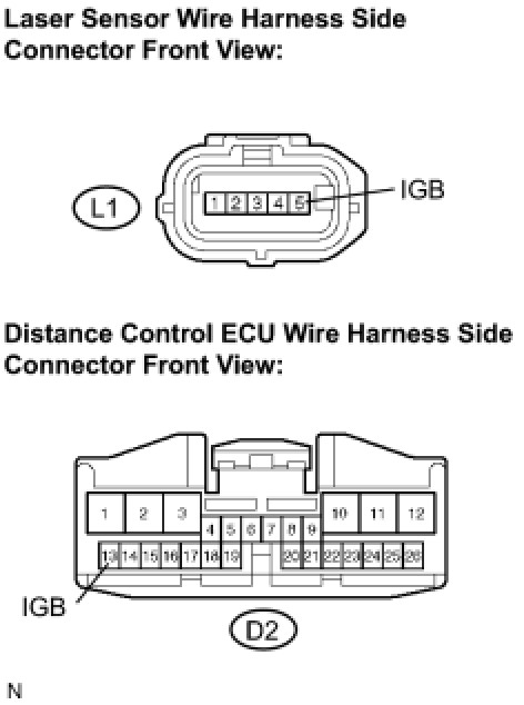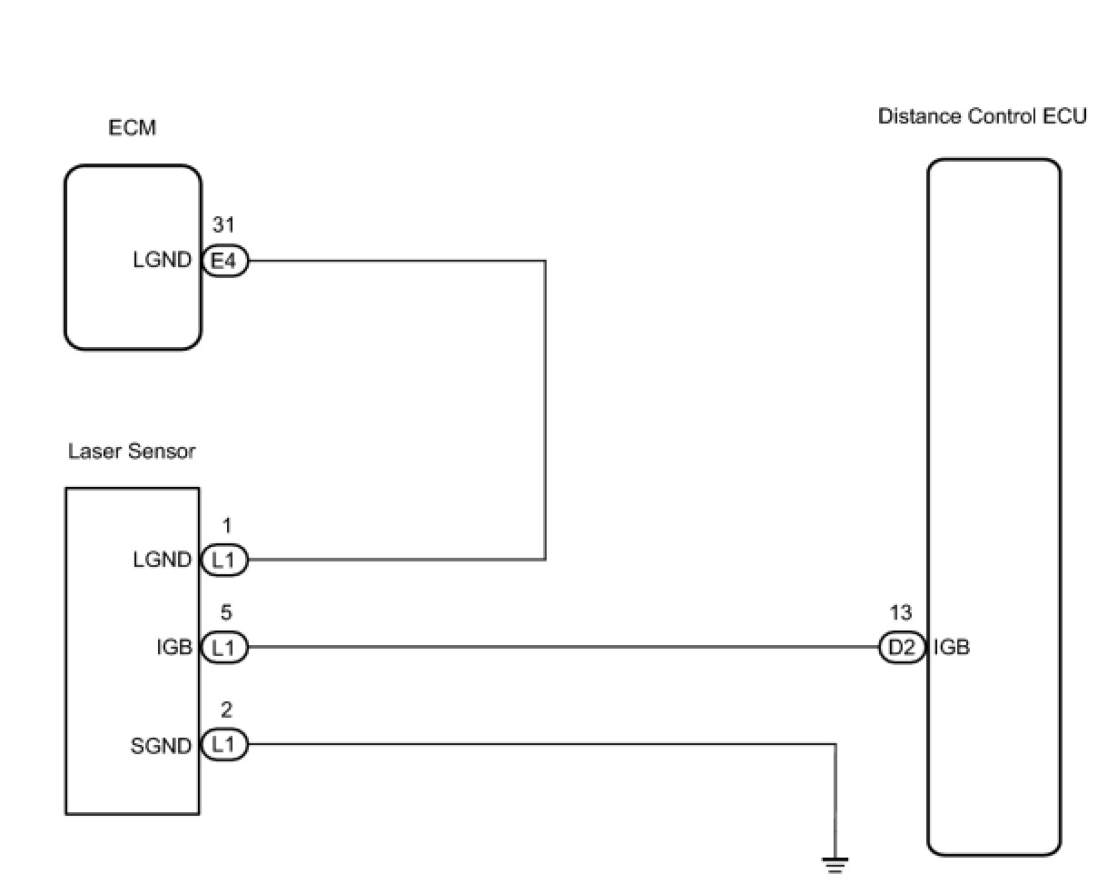 This circuit provides power to the laser sensor. The laser sensor emits radio waves towards an object in front and measures the distance and direction of the object by receiving the beam reflections. Based on the reflections, the sensor calculates the difference in speed between the vehicle and the object in front. This data is transmitted to the distance control ECU. The ECM recognizes the laser sensor via terminals LGND. If an open circuit occurs in the wire harness between terminals LGND, the ECM cannot recognize the laser sensor. The ECM will stop the control of the vehicle-to-vehicle distance control mode and only the constant speed control mode can be used.