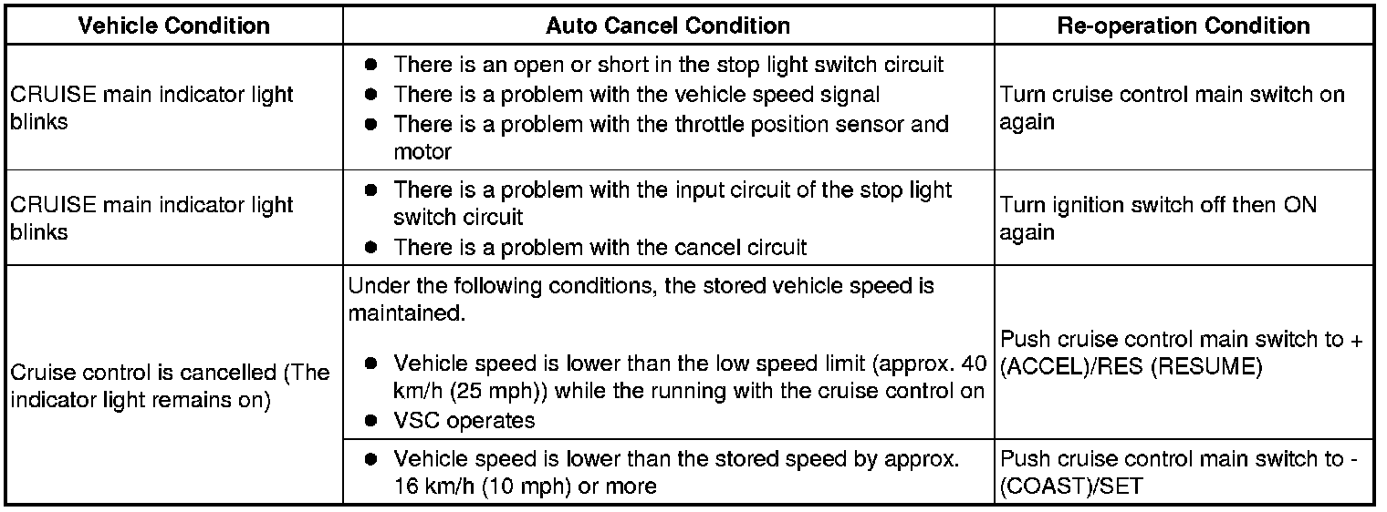 HINT: If the following conditions are detected while the cruise control is in operation, the system clears the stored vehicle speed in the ECM and cancels the cruise control operation.