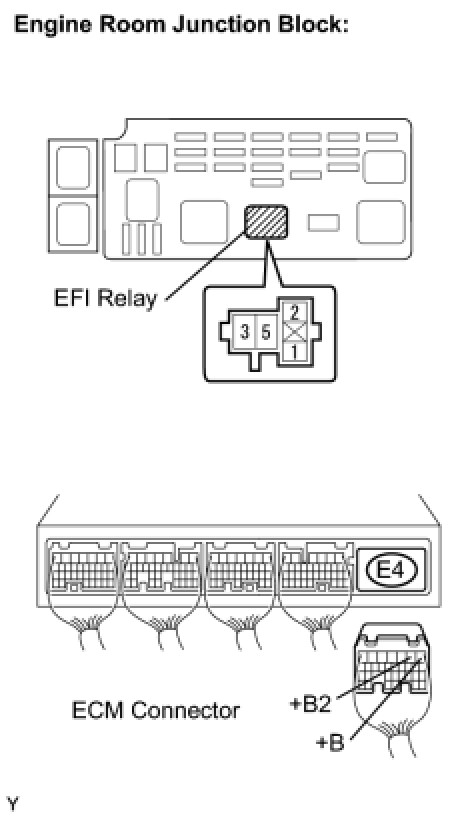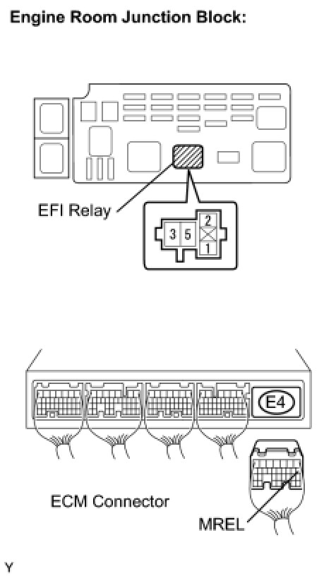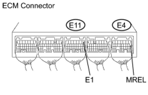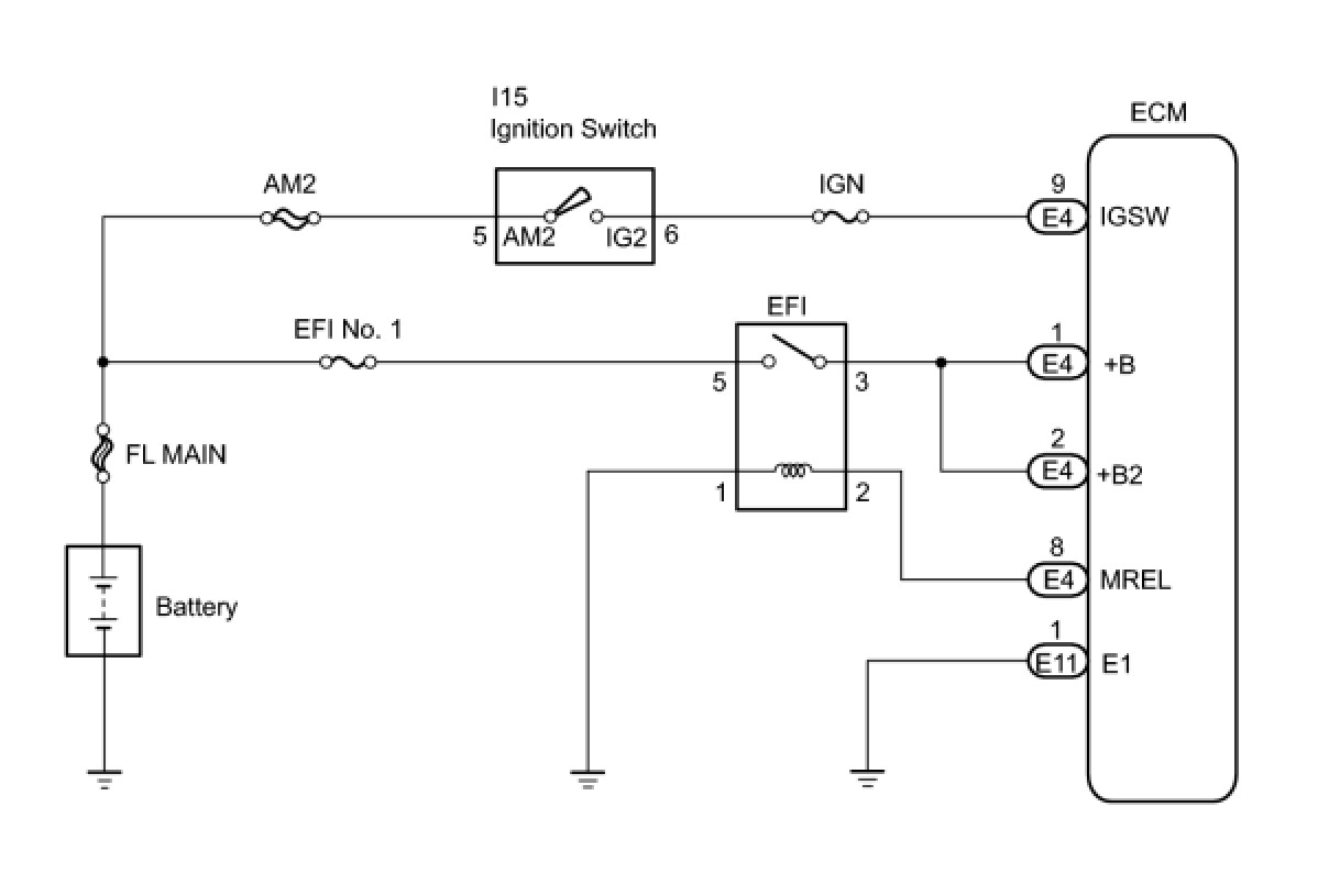When the ignition switch is turned to the ON position, the battery voltage is applied to terminal IGSW of the ECM. The ECM MREL output signal causes a current to flow to the coil, closing the contacts of the EFI relay and supplying power to terminal +B of the ECM.