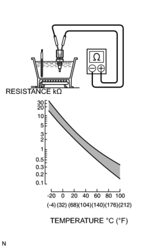 NOTICE: In case of checking the engine coolant temperature sensor in water, do not allow water to go into the terminals. After checking, dry the engine coolant temperature sensor.