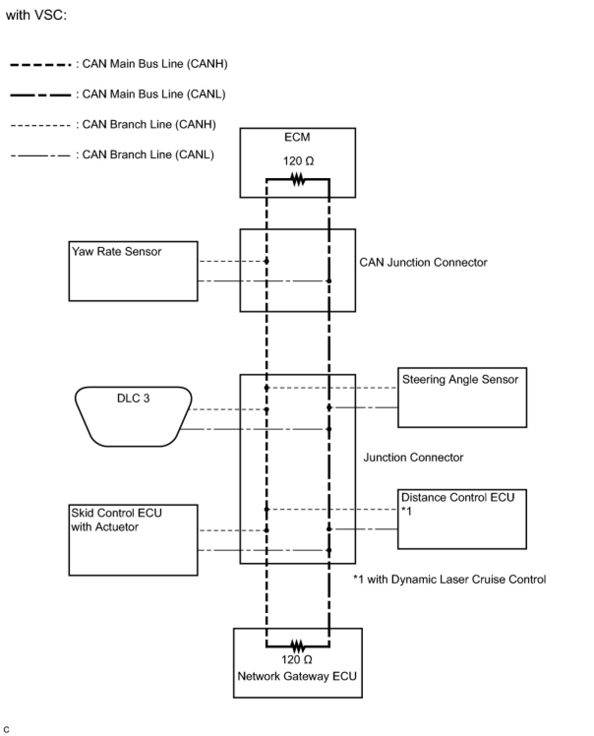 (1) Two resistors of 120 Ohms resistance are installed in parallel across the ends of the CAN main bus wires. They are called terminating resistors. These resistors allow the changes of the voltage differential between the CAN bus wires to be accurately judged. To allow for proper function of CAN communication, it is necessary to have both terminating resistors installed. Since the two resistors are installed in parallel, a measurement of resistance between the two CAN bus wires should produce a reading of approximately 60 Ohms.