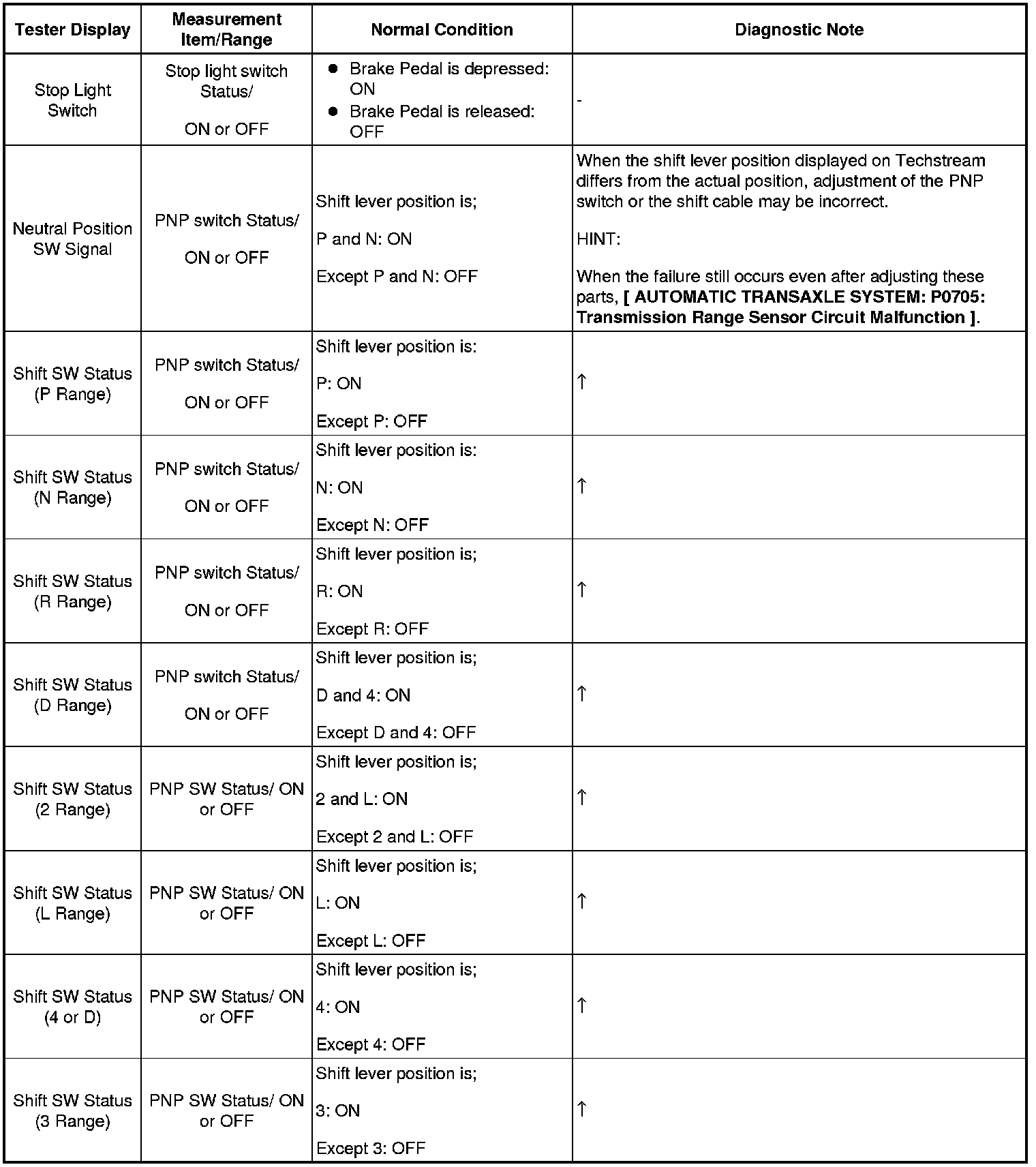 HINT: Using Techstream to read the Data List allows the values or states of switches, sensors, actuators and other items to be read without removing any parts. This non-intrusive inspection can be very useful because intermittent conditions or signals may be discovered before parts or wiring is disturbed. Reading the Data List information early in troubleshooting is one way to save diagnostic time.