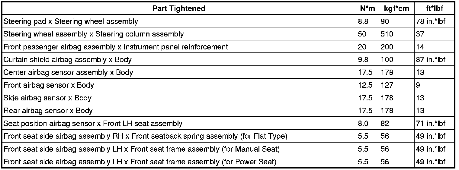 SERVICE SPECIFICATIONS: SUPPLEMENTAL RESTRAINT SYSTEM: TORQUE SPECIFICATIONS