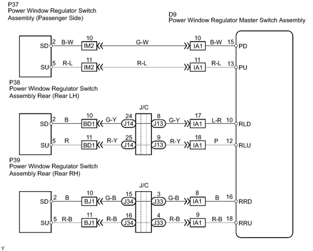 - There is an open or short circuit in the wiring between the power window master switch and the applicable power window regulator switch.