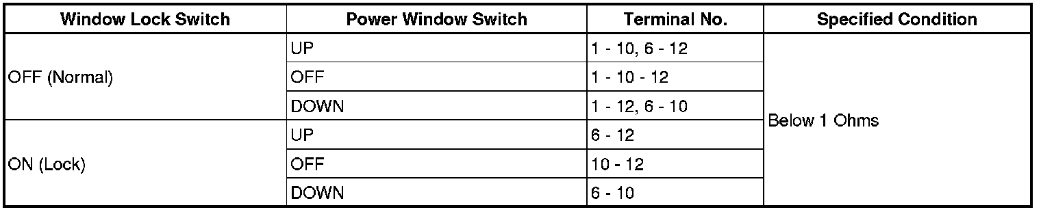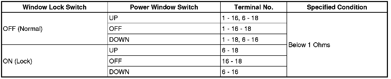(b) Check the resistance between the terminals of the master switch when each switch is operated, as shown in the table below.