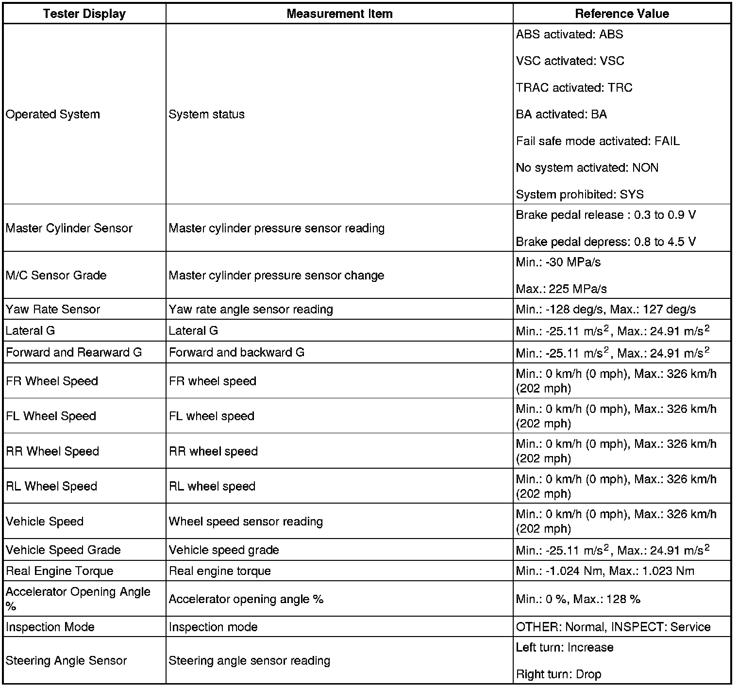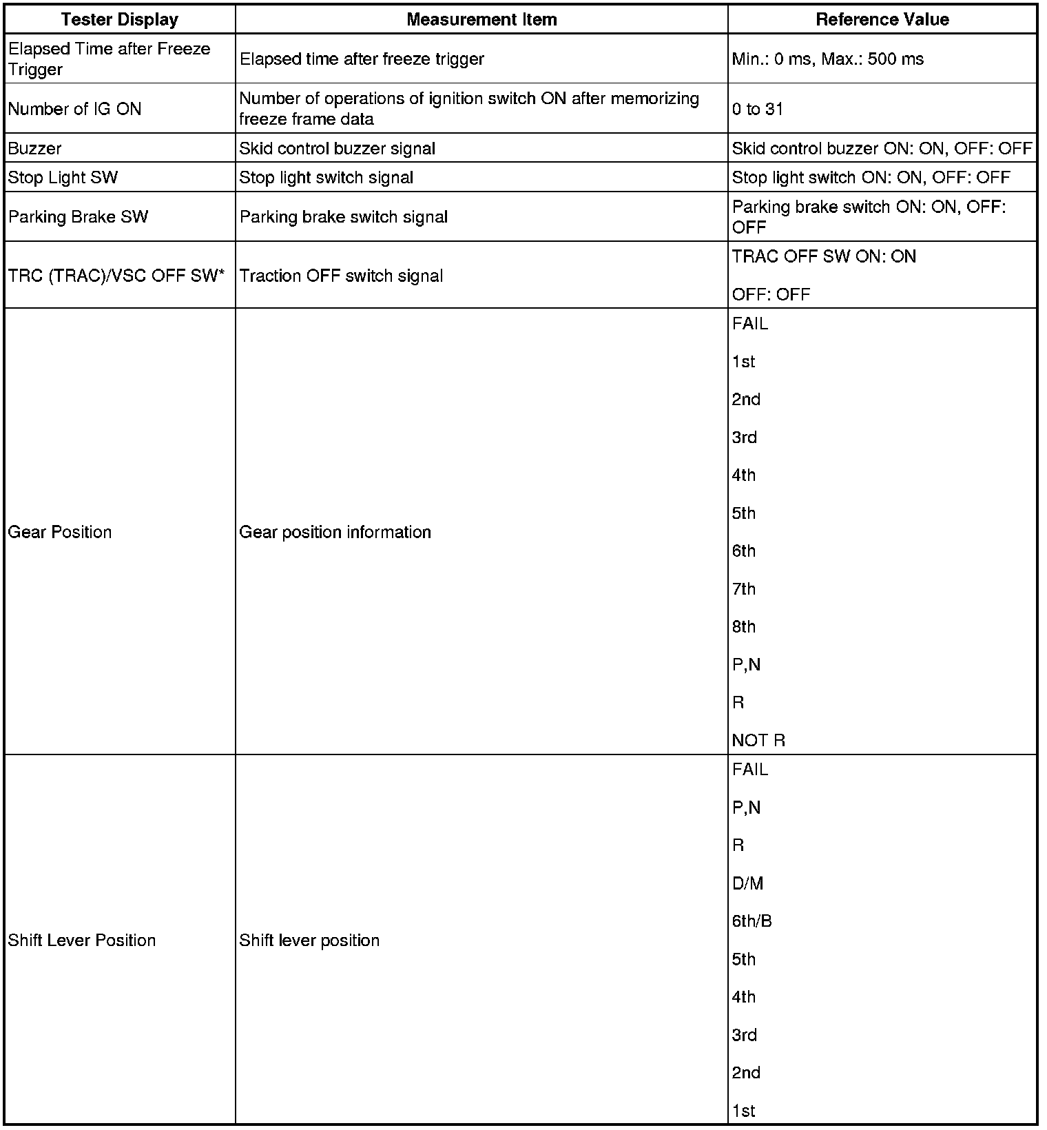 (a) The vehicle (sensor) status, stored during ABS and/or VSC operation or at the time of an error code detection, can be displayed by Techstream.