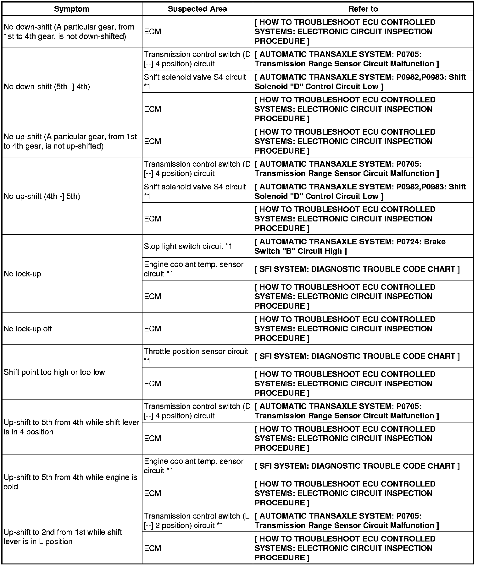 U151E AUTOMATIC TRANSAXLE: AUTOMATIC TRANSAXLE SYSTEM: PROBLEM SYMPTOMS TABLE