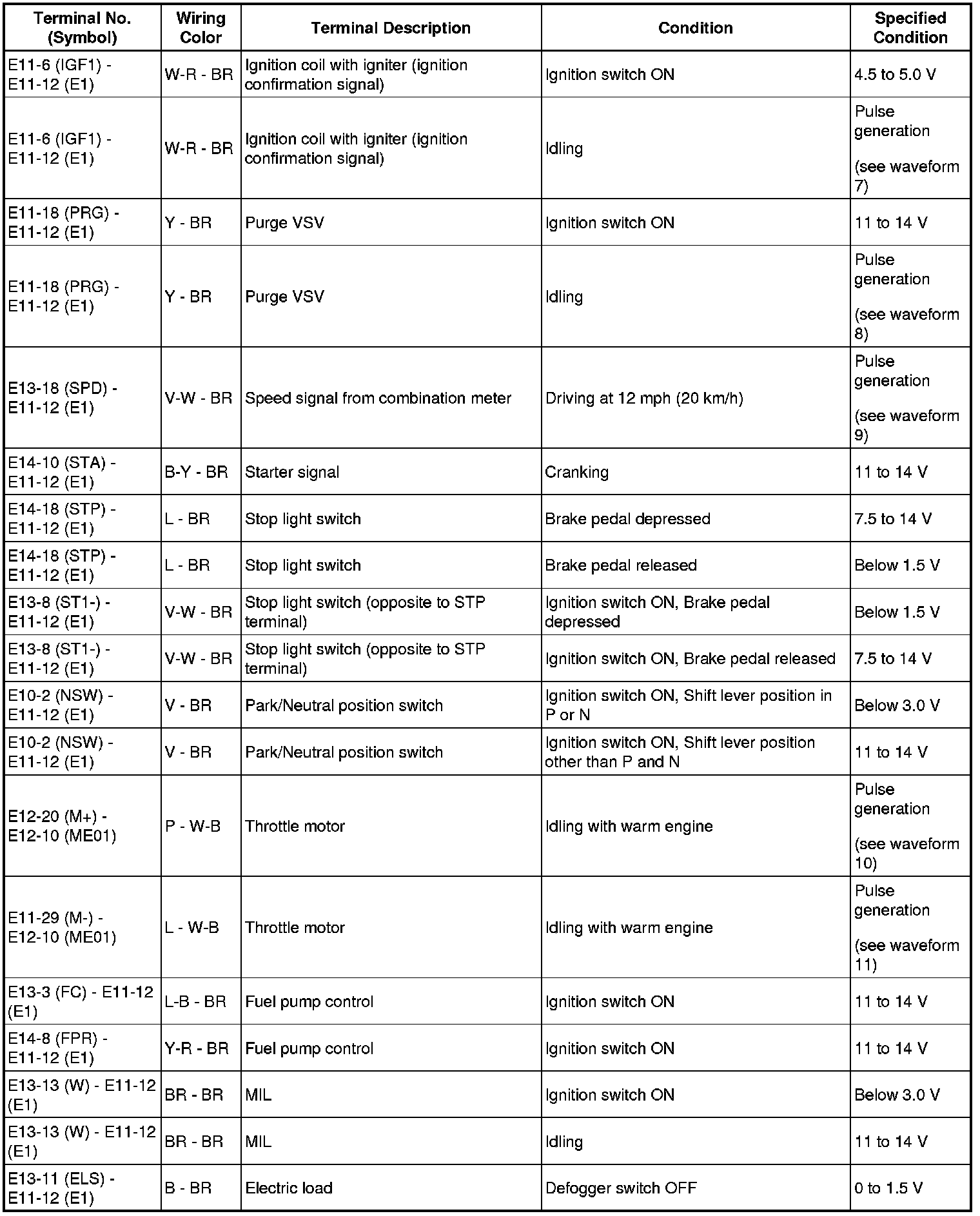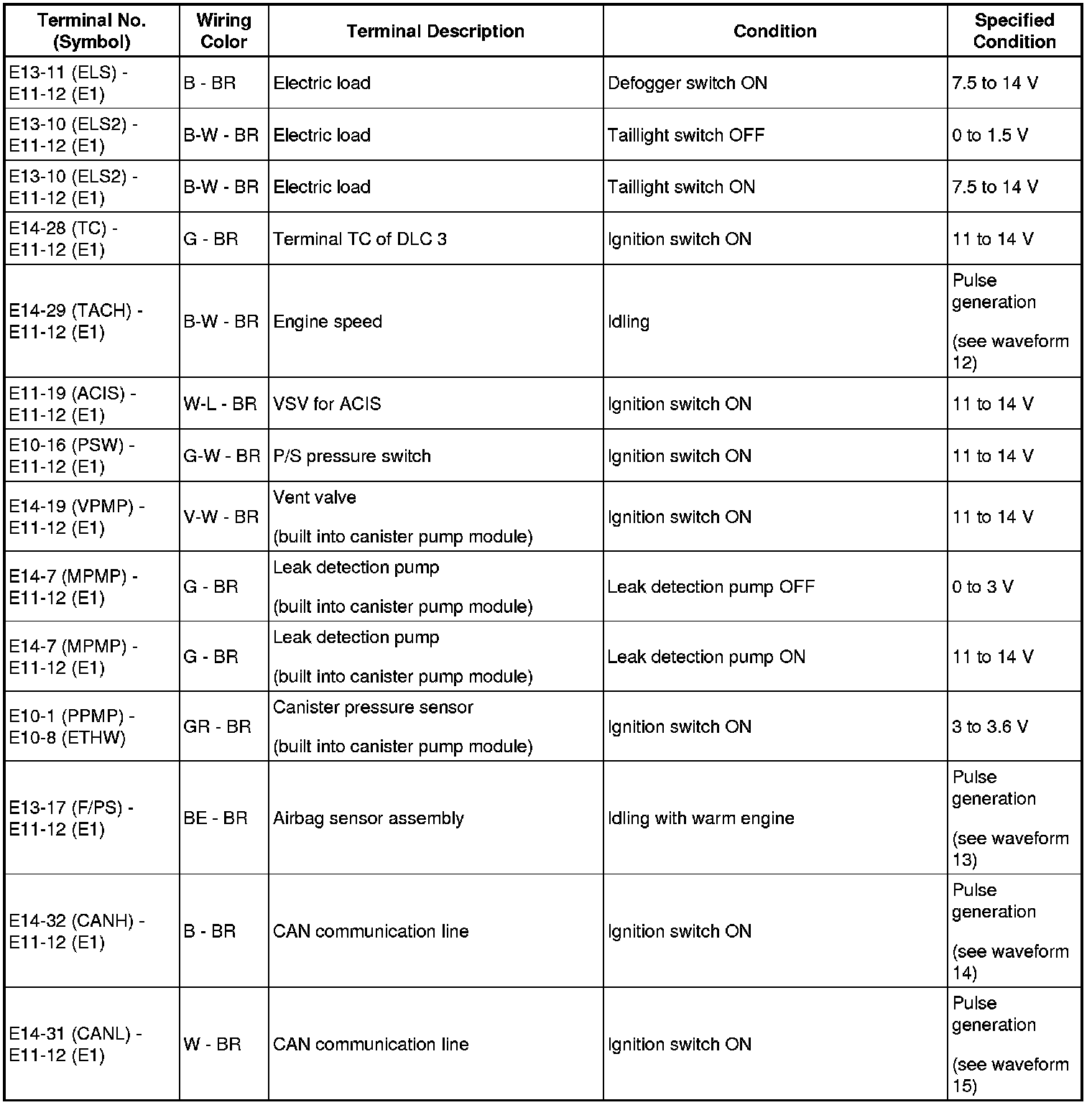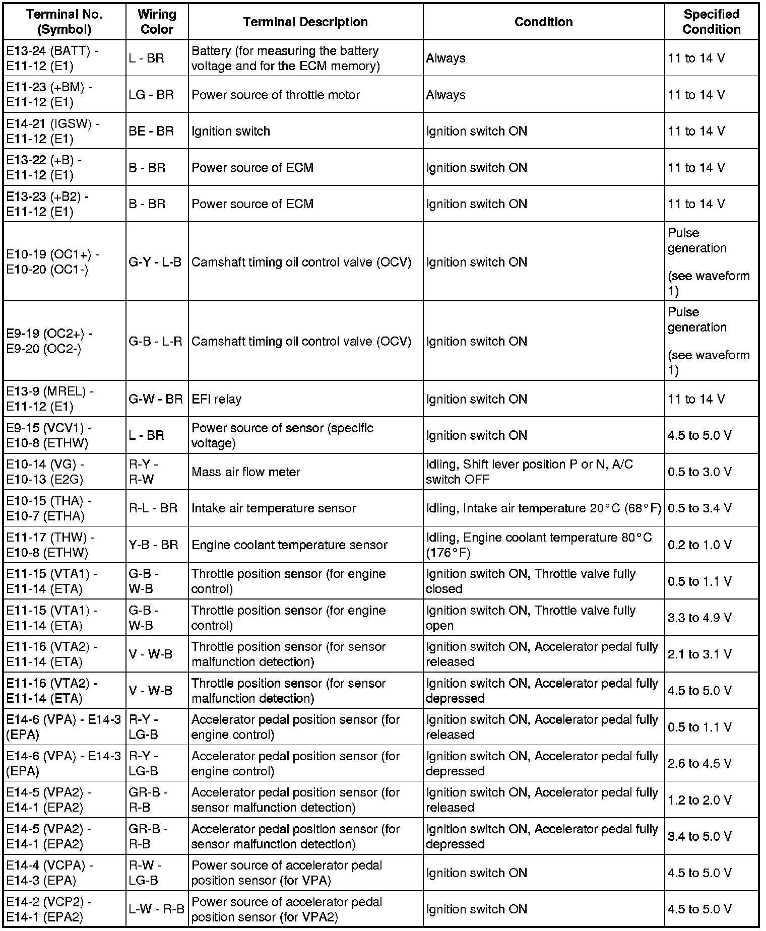 HINT: The standard normal voltage between each pair of ECM terminals is shown in the table below. The appropriate conditions for checking each pair of terminals are also indicated.