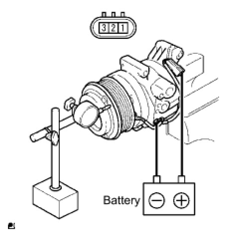 (c) Connect the battery positive lead to terminal 1 (MG+) of the magnet clutch connector and the negative lead to the earth wire. Turn the magnet clutch on and off and measure the clearance.