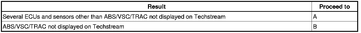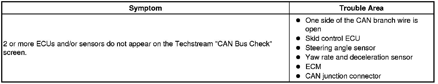 If 2 or more ECUs and/or sensors do not appear on the Techstream "CAN Bus Check" screen, one side of the CAN branch wire may be open. (ONE side of the CANH [branch wire] / CANL [branch wire] of the ECU and/or sensor is open.)