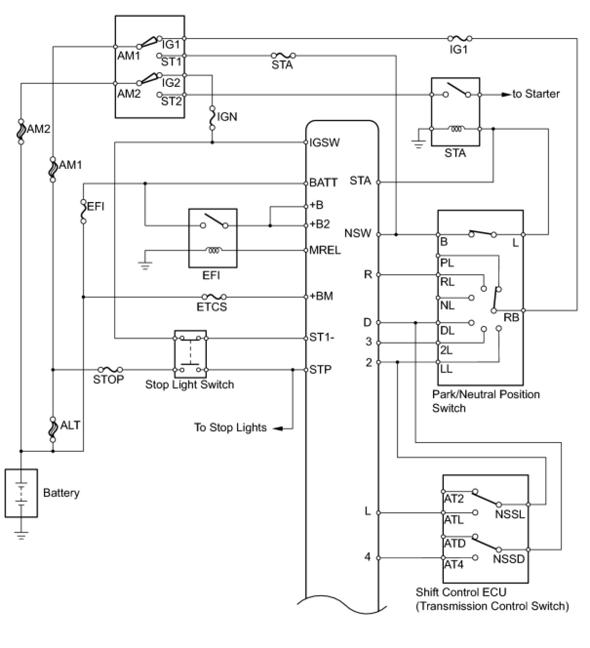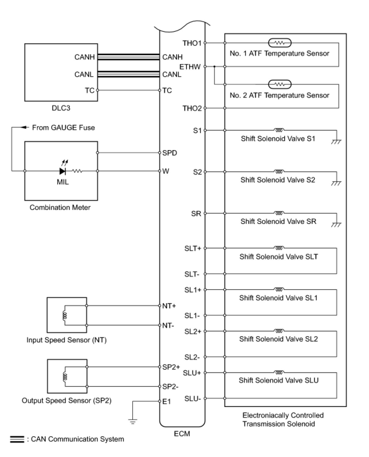 The configuration of the electronic control system in the A750E automatic transmission is as shown in the following chart.