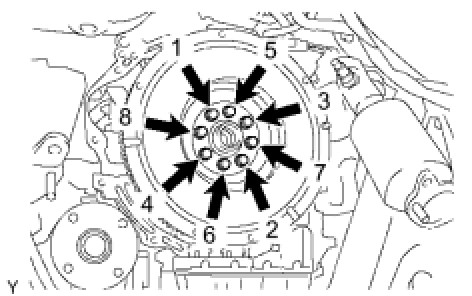 Using several steps, uniformly install and tighten the 8 mounting bolts in the sequence shown in the illustration.