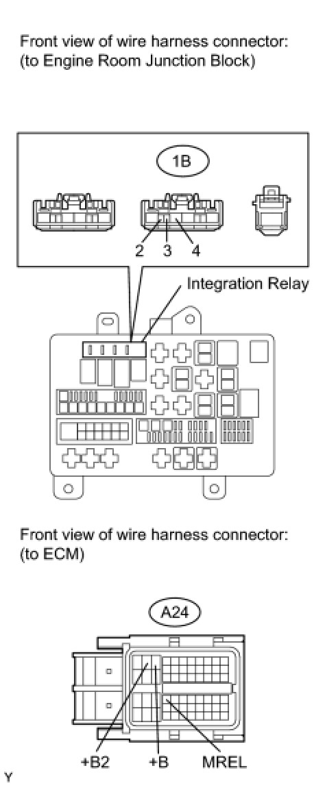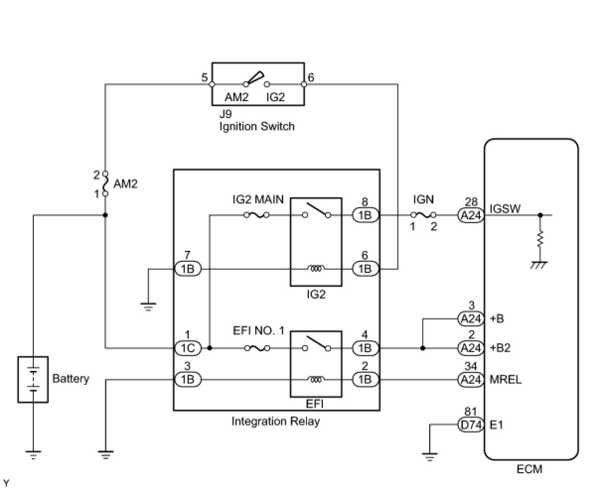 When the ignition switch is turned ON, the battery voltage is applied to the IGSW of the ECM. The output signal from the MREL terminal of the ECM causes a current to flow to the coil, closing the contacts of the integration relay (EFI relay) and supplying power to either terminal +B or +B2 of the ECM.