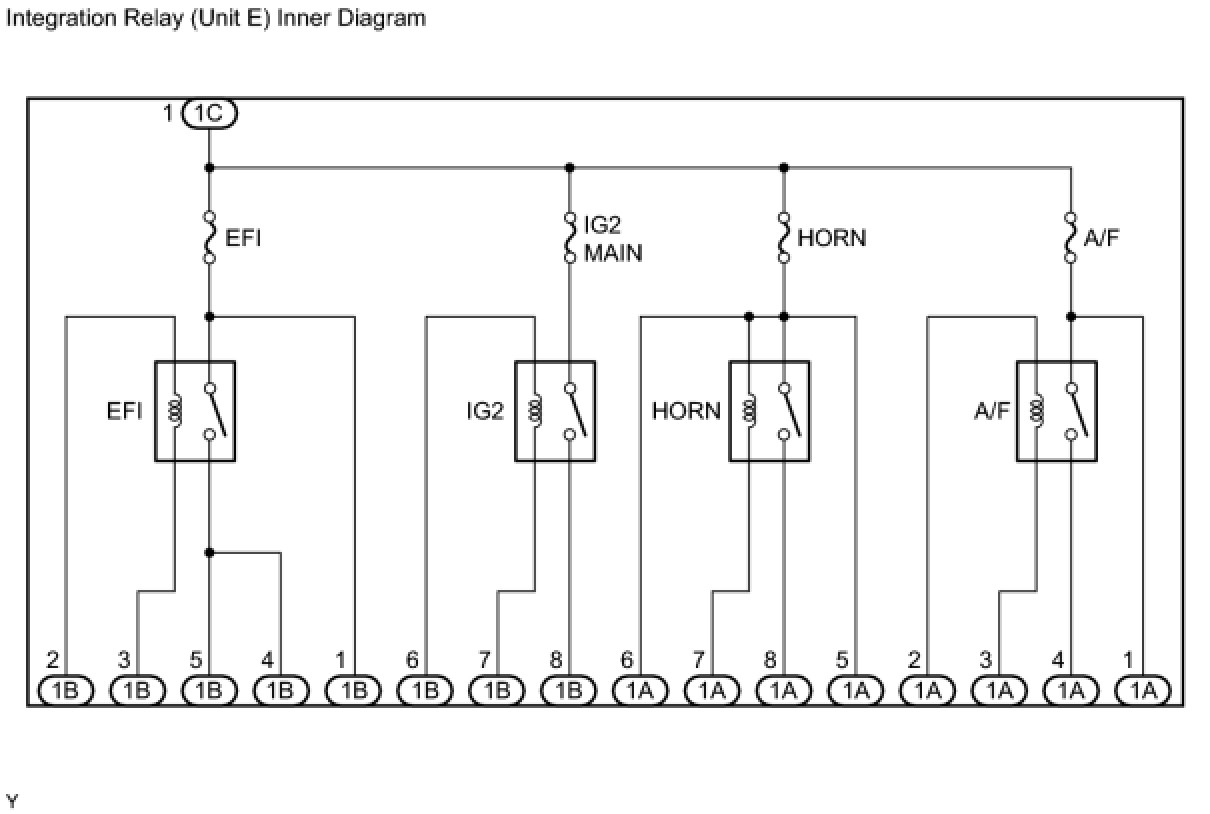 - The internal circuit of the integration relay is as shown in the illustration below. Inspect the integration relay using the following procedures.