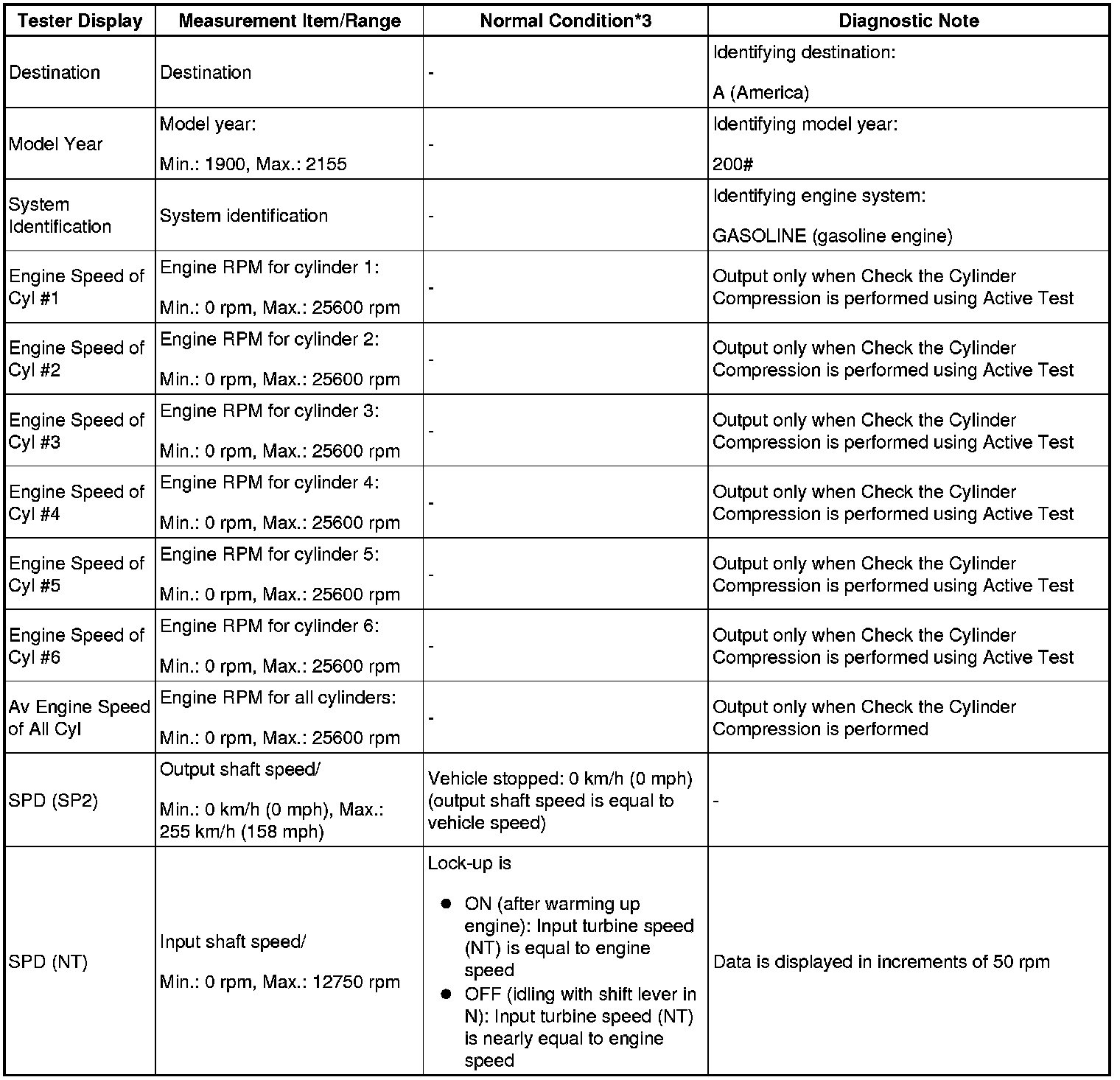 HINT: If the results are not displayed normally, select the display items from the Data List before performing the Active Test. Enter the following menus: Powertrain / Engine and ECT / Data List / Compression / Engine Speed of Cyl #1, Engine Speed of Cyl #2, Engine Speed of Cyl #3, Engine Speed of Cyl #4, Engine Speed of Cyl #5, Engine Speed of Cyl #6 and Av Engine Speed of All Cyl.