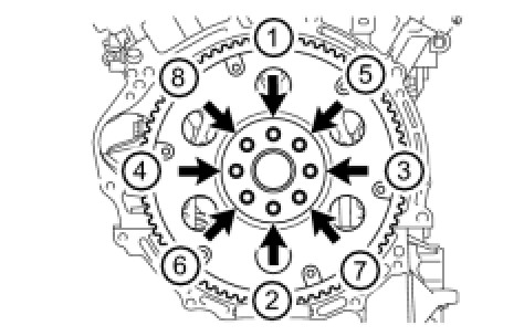 Tighten the 8 bolts uniformly in several steps in the order shown in the illustration.
