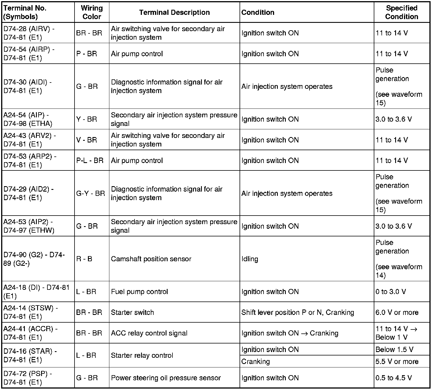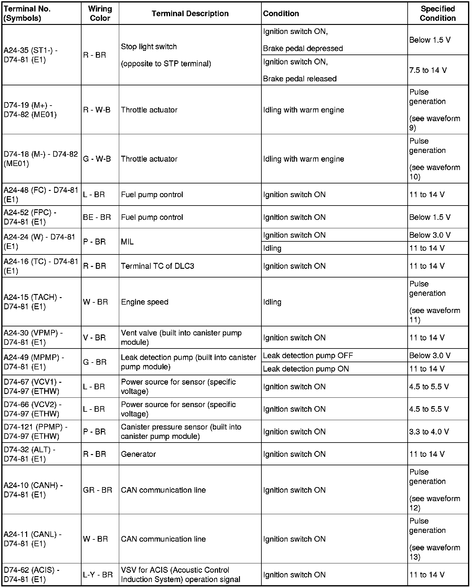 HINT: The standard normal voltage between each pair of ECM terminals is shown in the table below. The appropriate conditions for checking each pair of terminals are also indicated. The result of checks should be compared with the standard normal voltage for that pair of terminals, displayed in the Specified Condition column. The illustration above can be used as a reference to identify the ECM terminal locations.