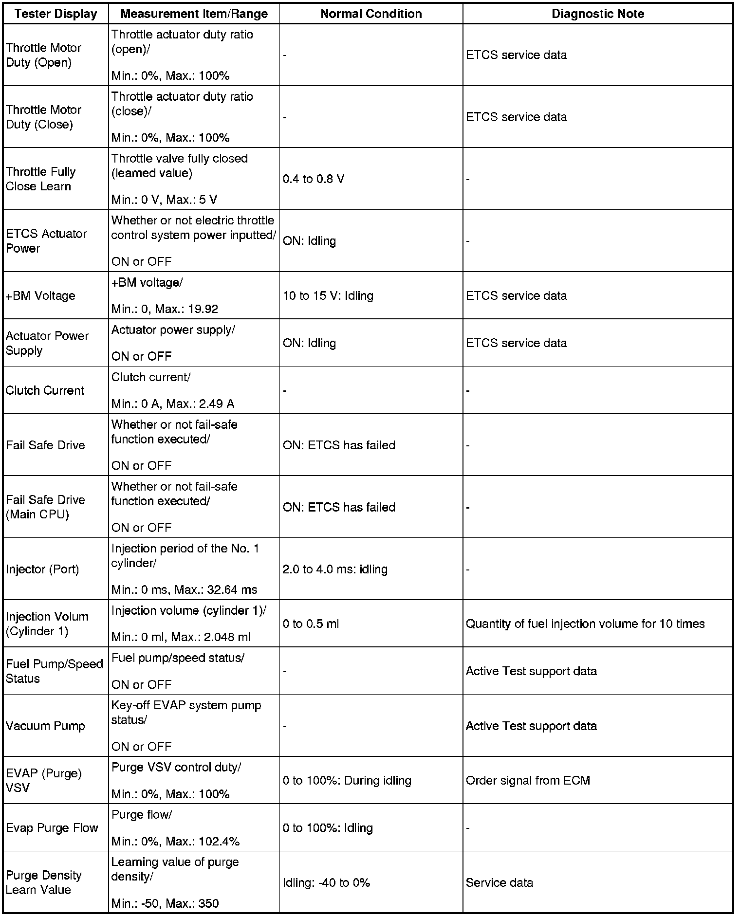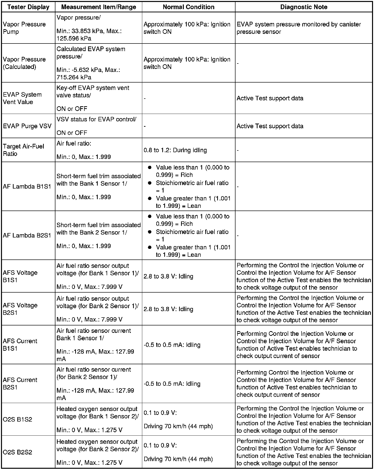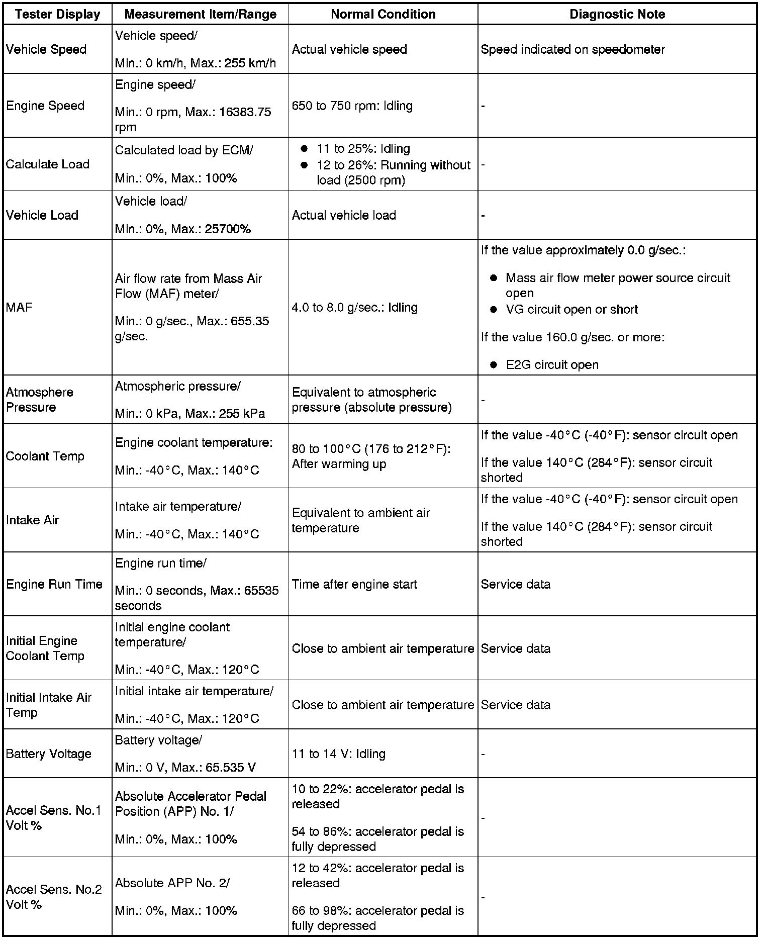 HINT: Using the Techstream to read the Data List allows the values or states of switches, sensors, actuators and other items to be read without removing any parts. This non-intrusive inspection can be very useful because intermittent conditions or signals may be discovered before parts or wiring is disturbed. Reading the Data List information early in troubleshooting is one way to save diagnostic time.