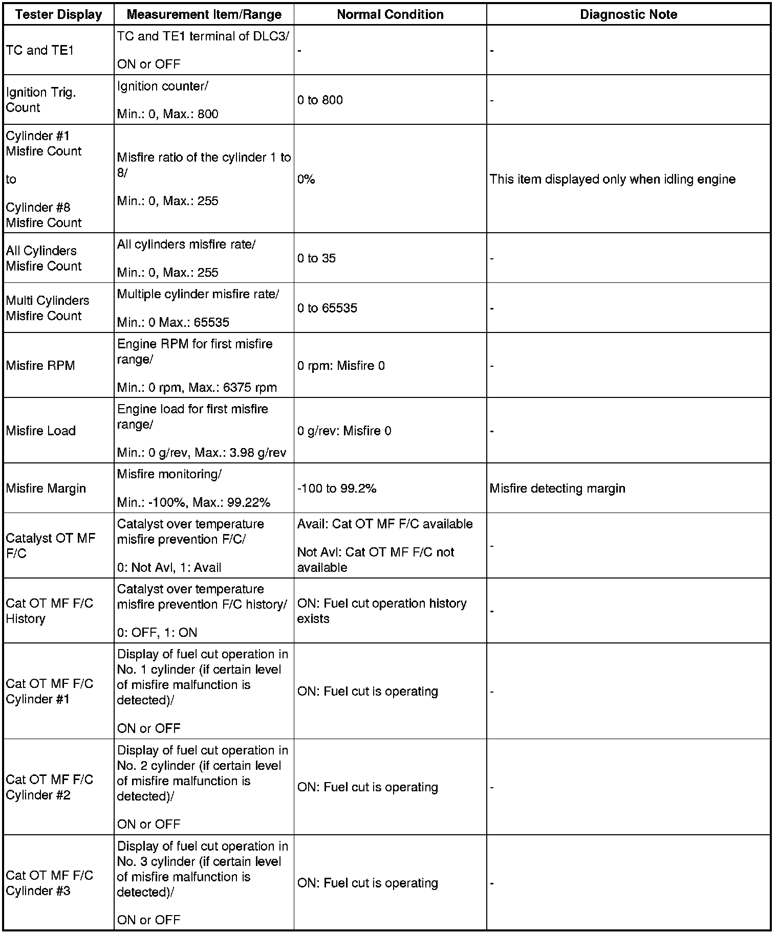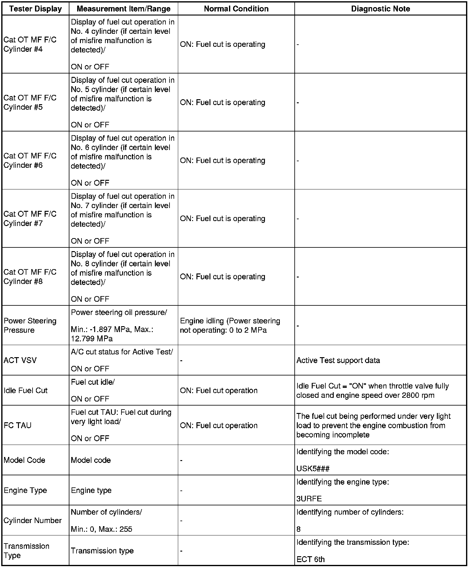 - *1: If the display of the Data List's Prohibit the Catalyst OT Misfire prevent F/C item is Avail, perform this Active Test as described below.