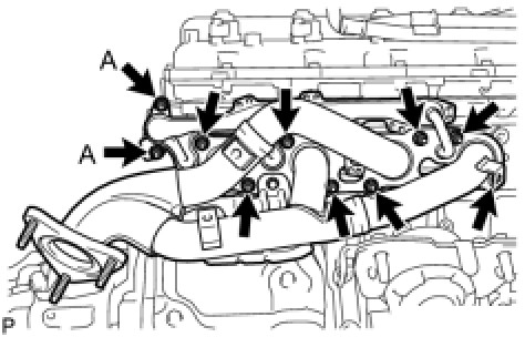 EXHAUST MANIFOLD SUB-ASSEMBLY RHTemporarily install the exhaust manifold and then uniformly tighten 8 new nuts that are not labeled A. Then tighten the new nuts labeled A in the illustration.