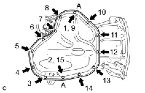 with the 11 bolts and 2 nuts in several steps, in the sequence shown in the illustration.