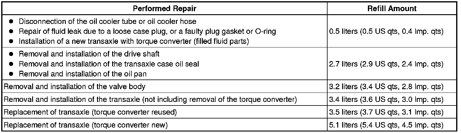 (a) Fill the transaxle with the correct amount of fluid as listed in the table below.