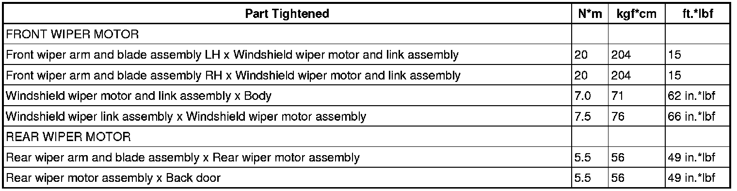 SPECIFICATIONS: WIPER / WASHER: TORQUE SPECIFICATIONS