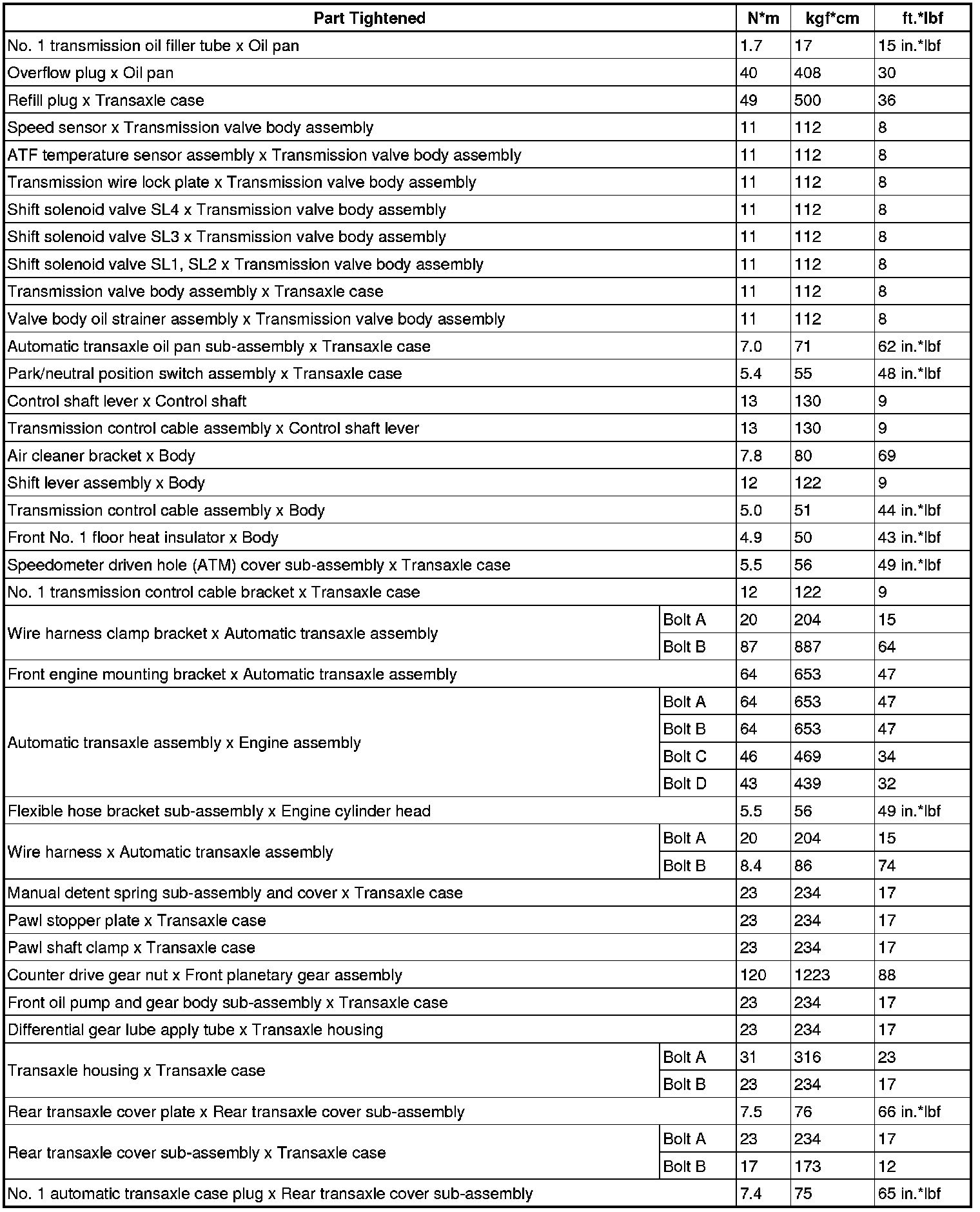 SPECIFICATIONS: U660F AUTOMATIC TRANSMISSION / TRANSAXLE: TORQUE SPECIFICATIONS