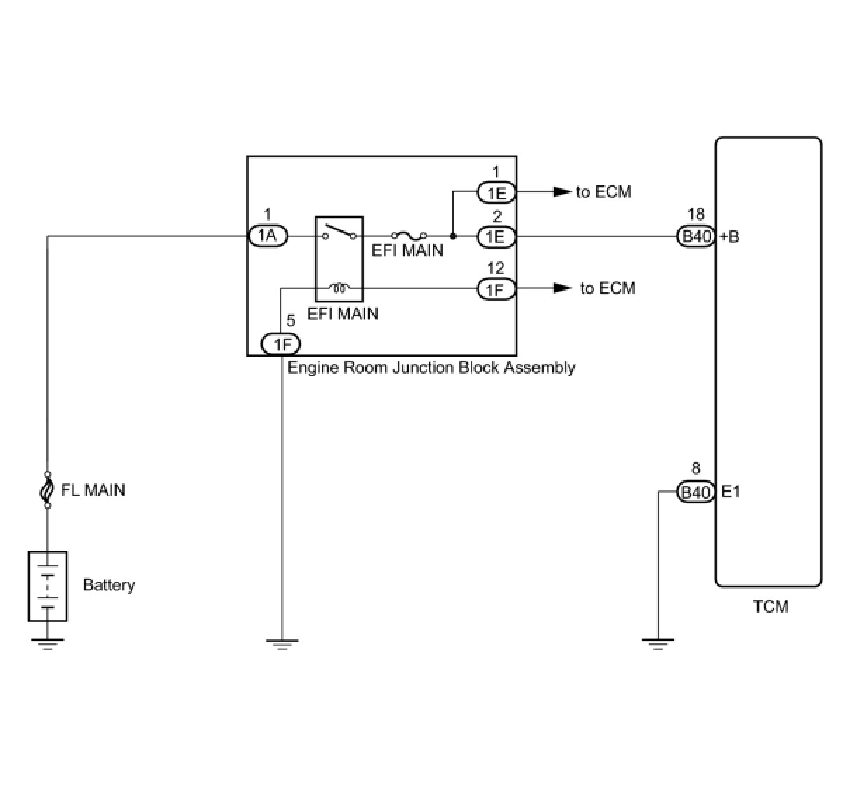 When the ignition switch is turned to ON, voltage from the ECM's MREL terminal is applied to the EFI MAIN relay. This causes the contacts of the EFI MAIN relay to close, which supplies power to terminal +B of the TCM.