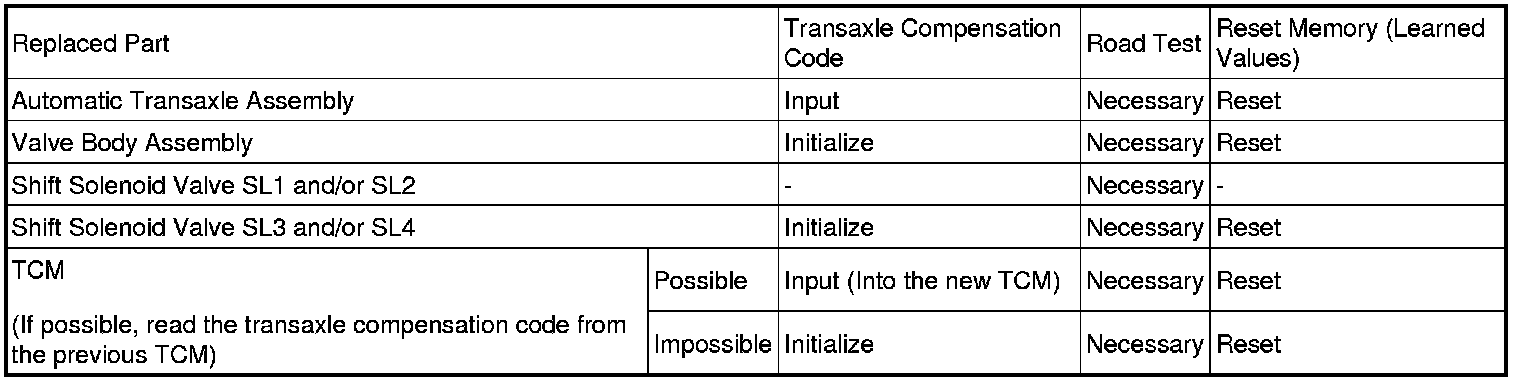 - If automatic transaxle parts are replaced, perform the following as necessary referring to the table below: