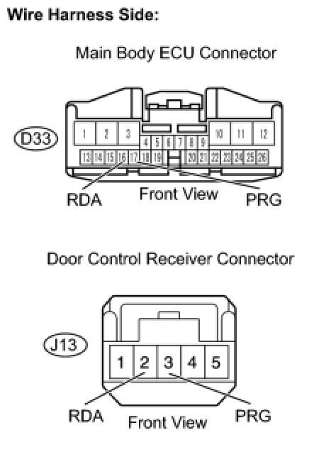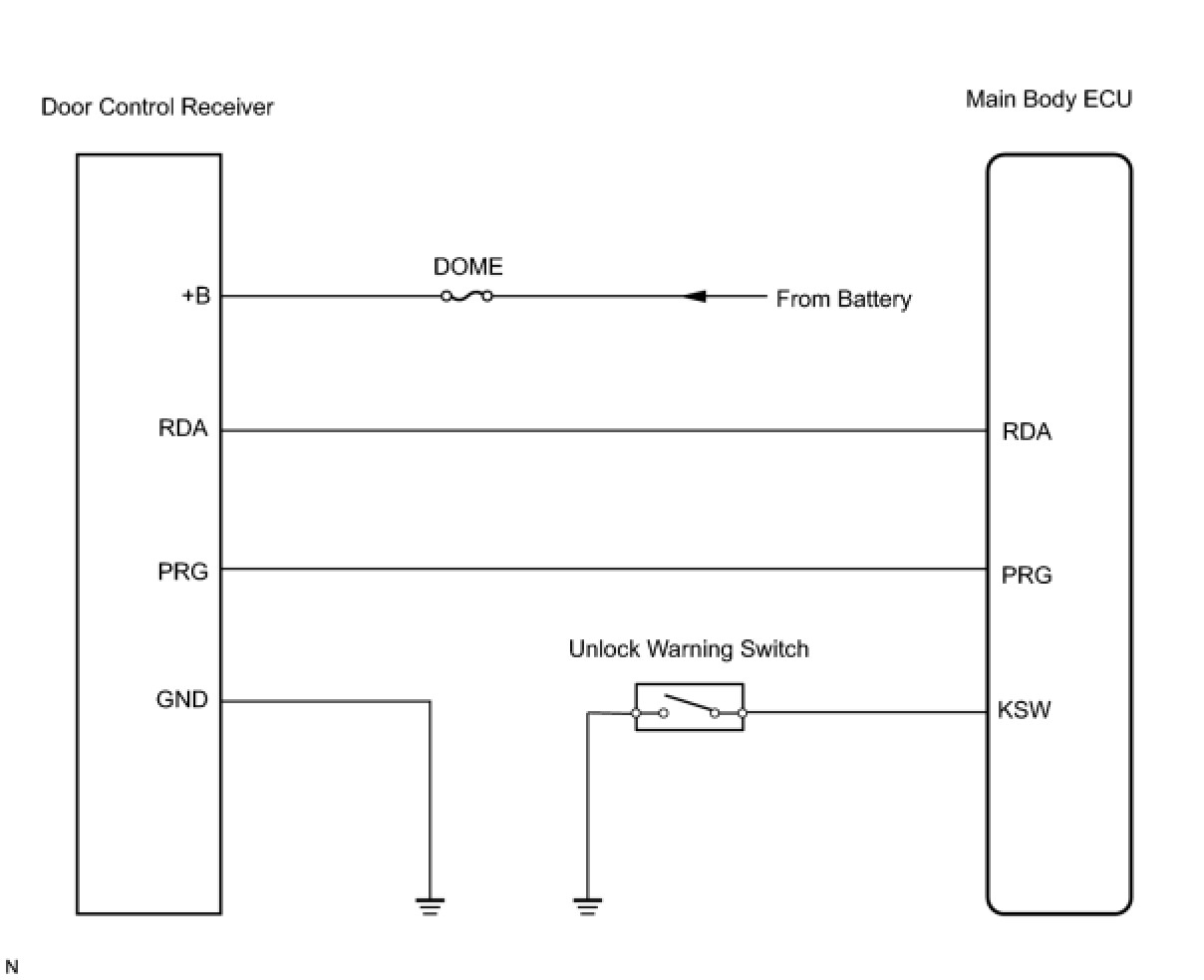 The door control receiver receives signals from the transmitter and sends these signals to the main body ECU. The main body ECU then controls all doors by sending lock / unlock signals to each door, and sends hazard flasher relay signals to the turn signal flasher relay (hazard warning lights).