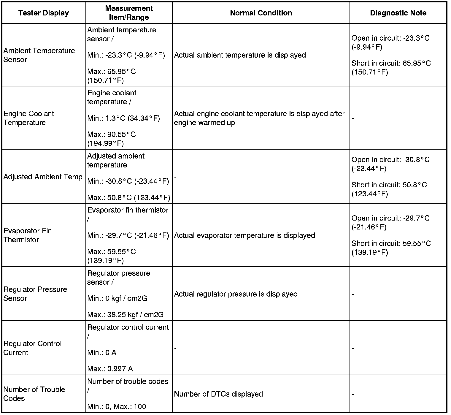 (f) Enter the following menus: Body Electrical / Air Conditioner / Data List /