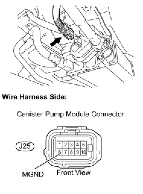 (c) Check the resistance between MGND terminal of the canister pump module connector and the body ground.