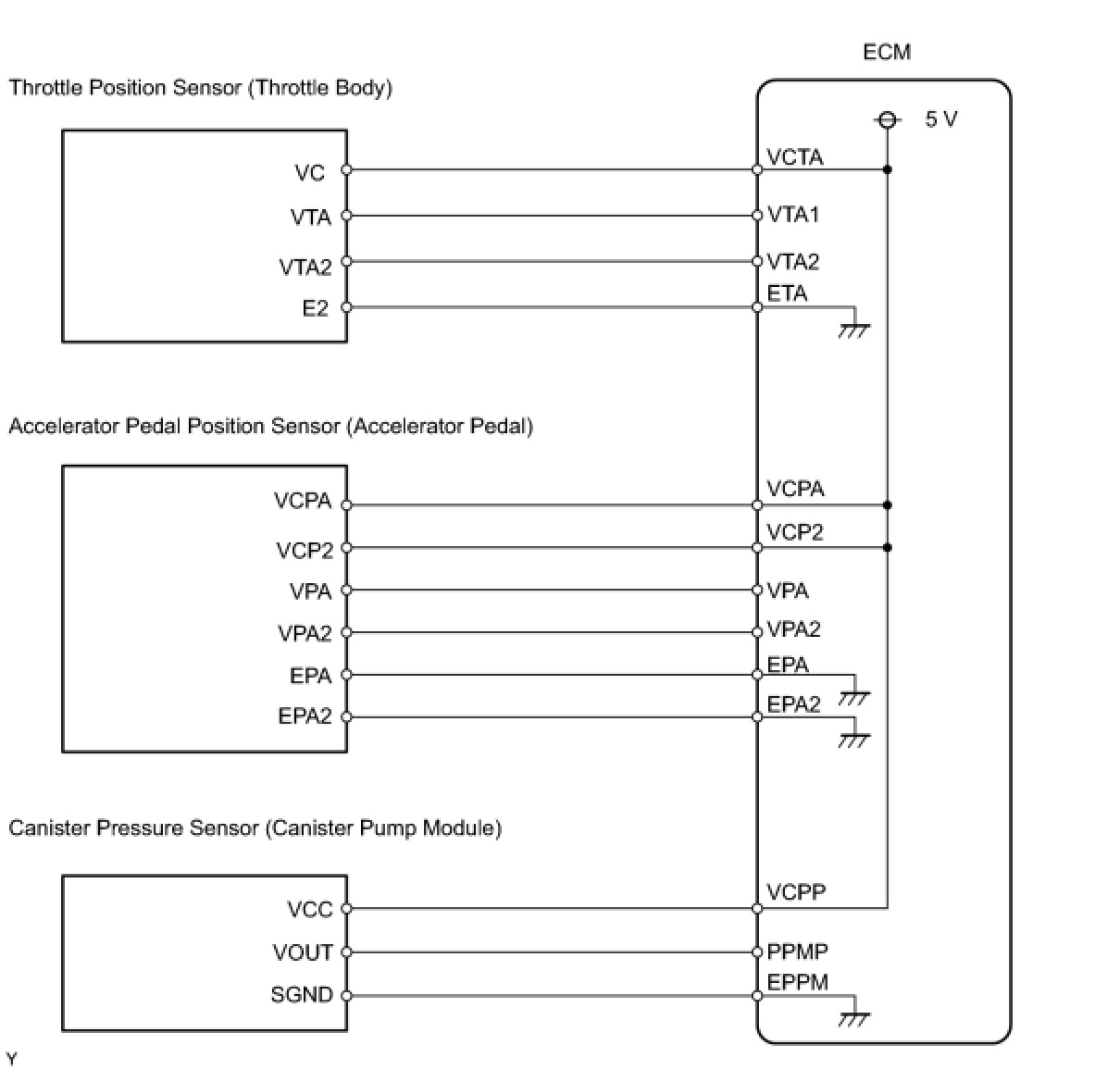 The ECM constantly generates 5 V power from the battery voltages supplied to the +B (BATT) terminal to operate the microprocessor. The ECM also provides this power to the sensors through the VC output circuit.