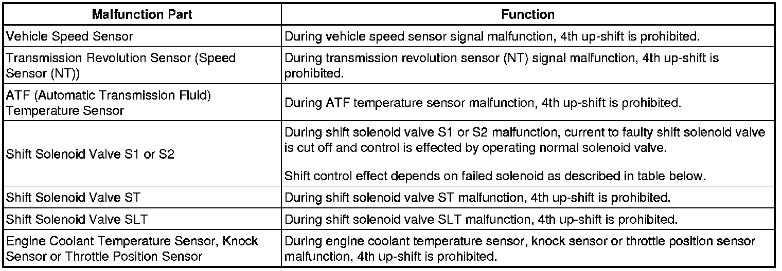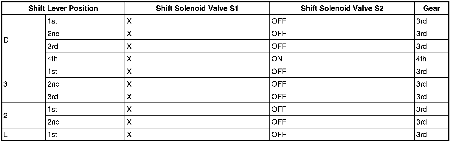 If either of the shift solenoid valve circuits develops an open or short, the ECM turns the other shift solenoid ON or OFF in order to shift into the gear positions shown in the table below.