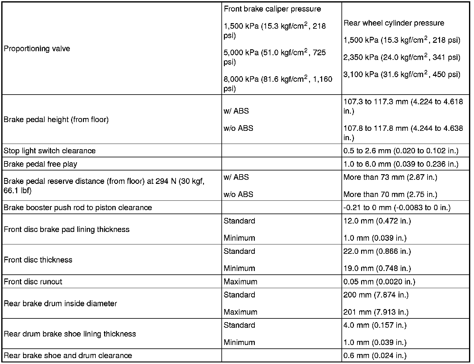 SERVICE SPECIFICATIONS: BRAKE: SERVICE DATA