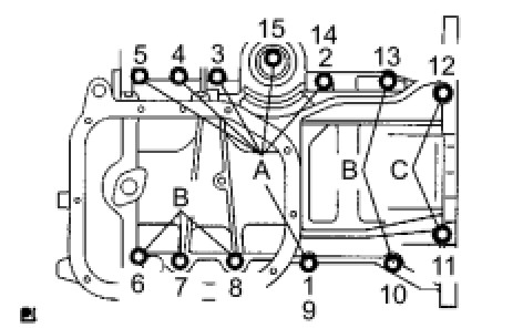 OIL PAN SUB-ASSEMBLYUsing several steps, install and tighten the 13 bolts uniformly in the sequence shown in the illustration.