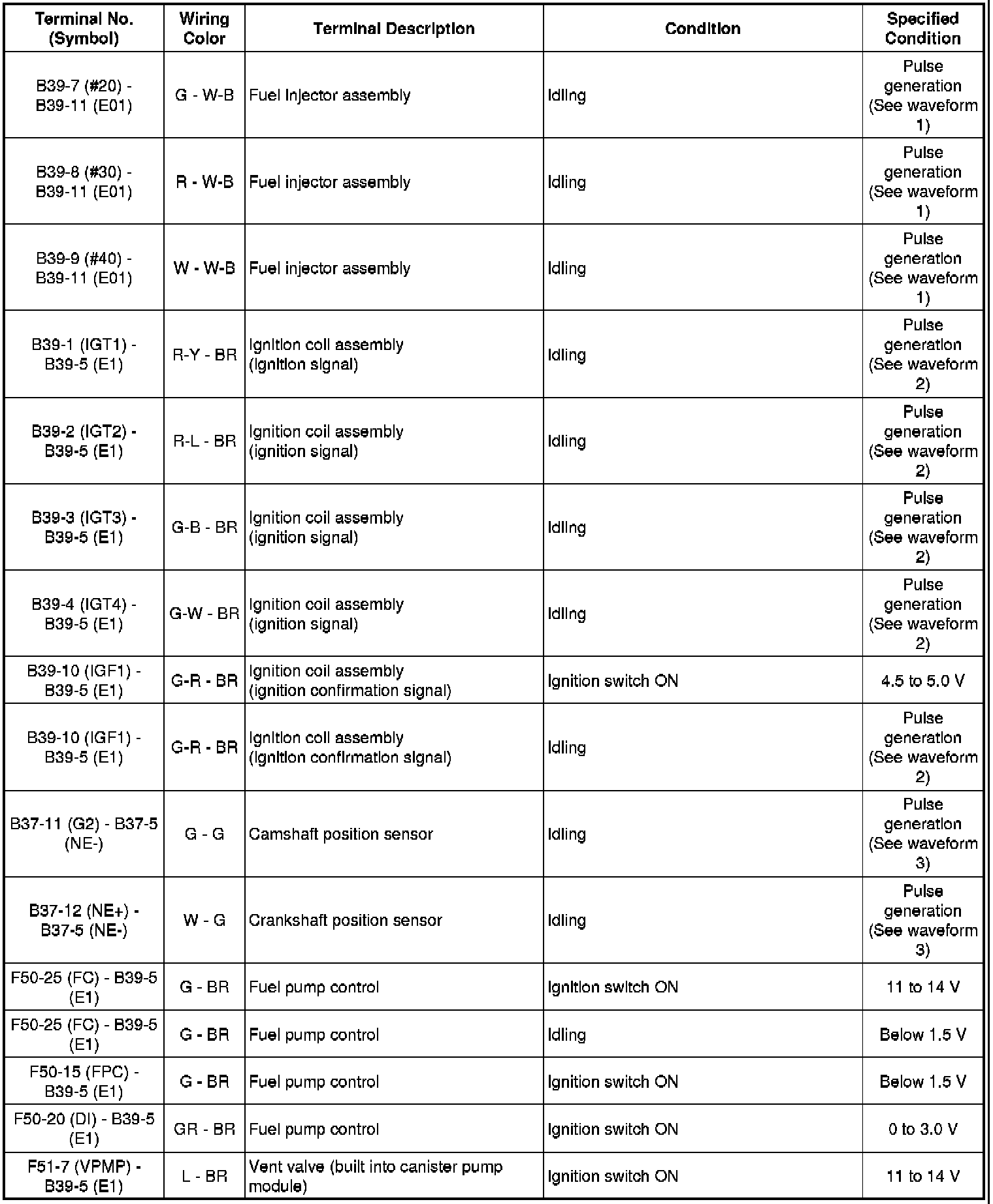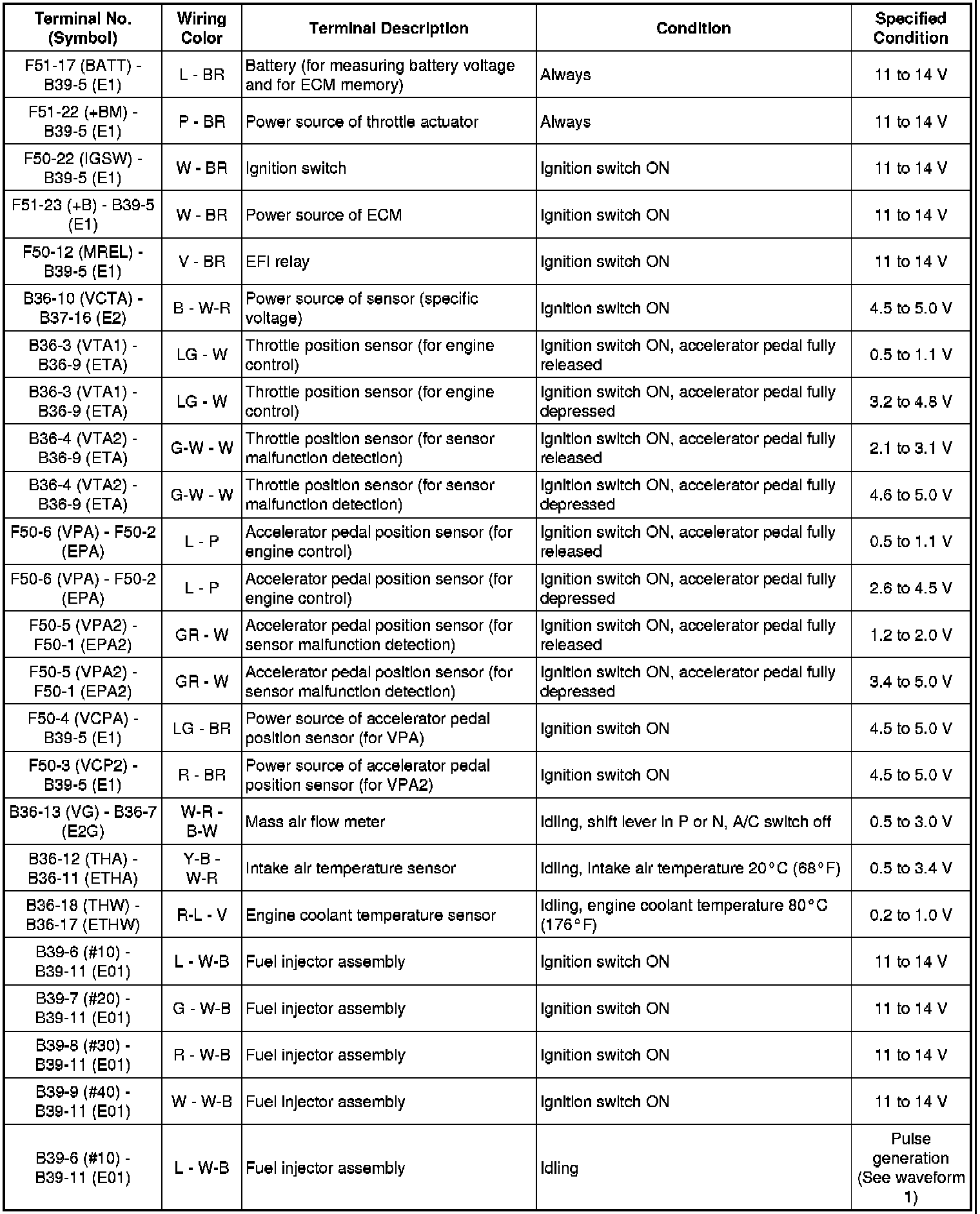 The standard voltage between each pair of ECM terminals is shown in the table below. The appropriate conditions for checking each pair of terminals are also indicated. The result of checks should be compared with the standard voltage for that pair of terminals displayed in the "Specified Condition" column. The illustration above can be used as a reference to identify the ECM terminal locations.