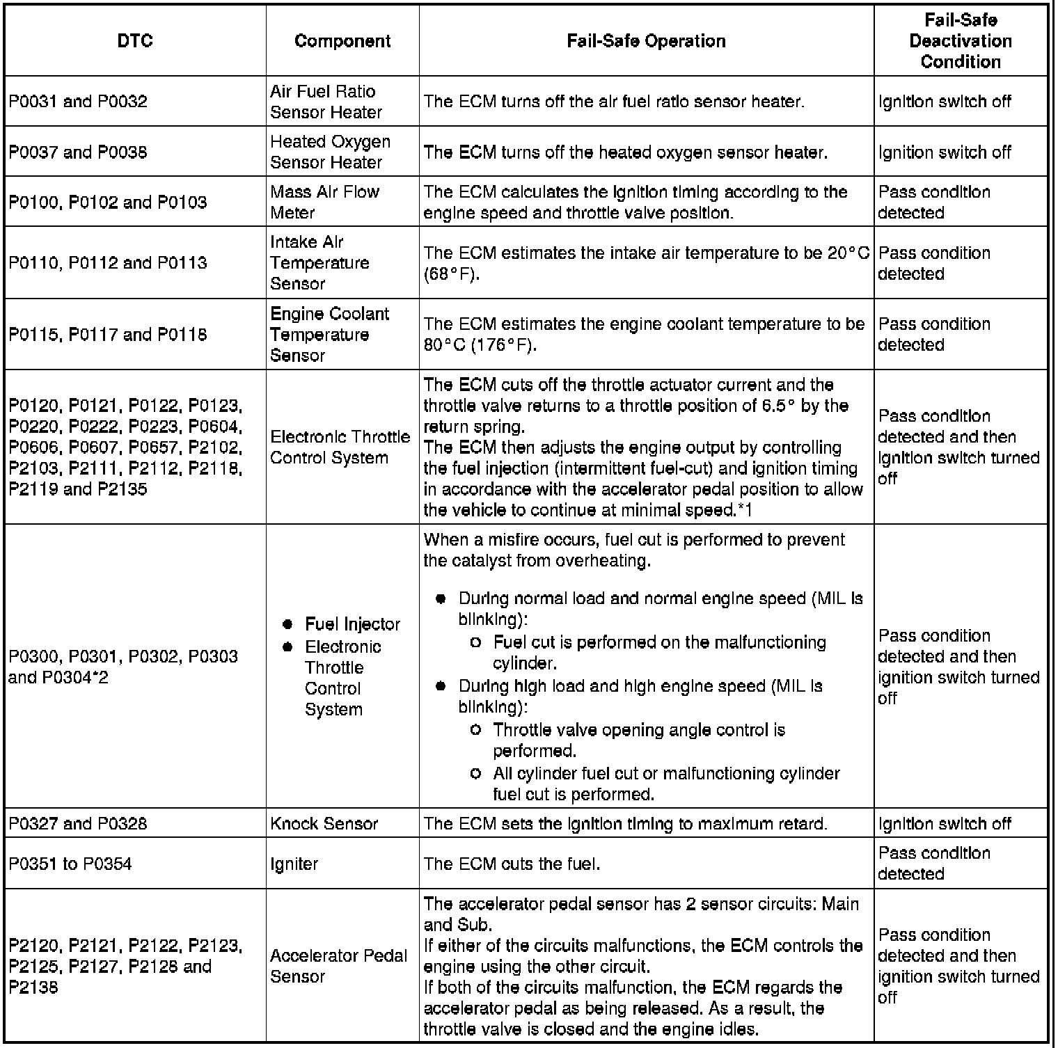 If any of the following DTCs are stored, the ECM enters fail-safe mode to allow the vehicle to be driven temporarily.