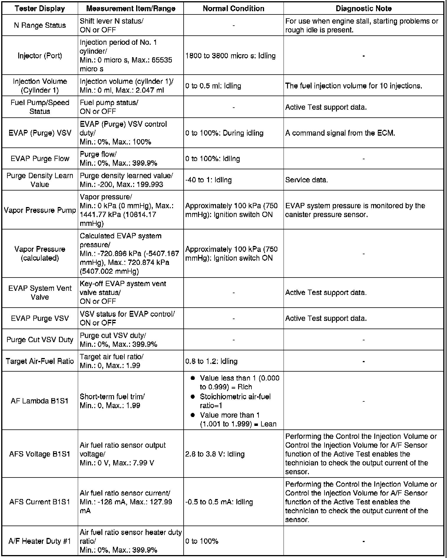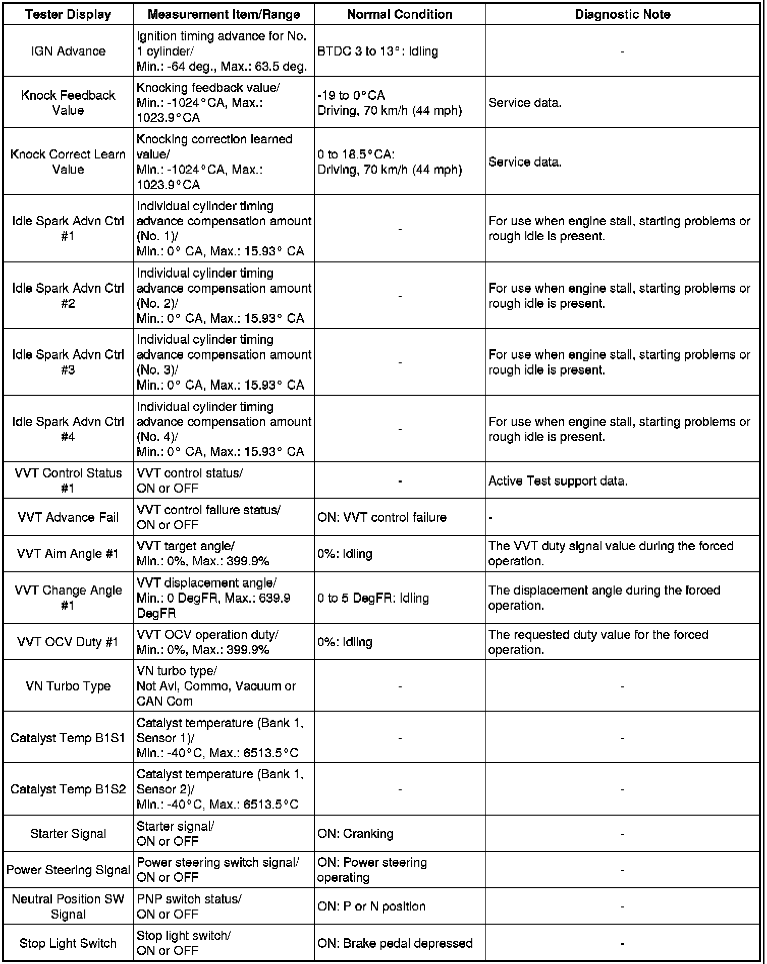 Using the Techstream to read the Data List allows the values or states of switches, sensors, actuators and other items to be read without removing any parts. This non-intrusive inspection can be very useful because intermittent conditions or signals may be discovered before parts or wiring is disturbed. Reading the Data List information early in troubleshooting is one way to save diagnostic time.