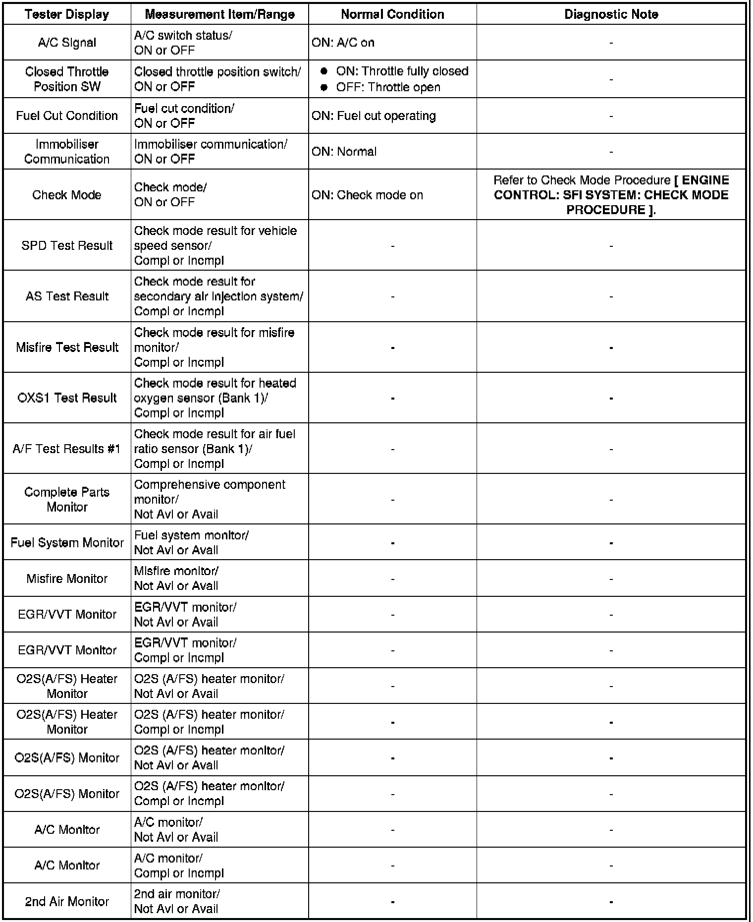 (d) Perform the system check by referring to the table below.