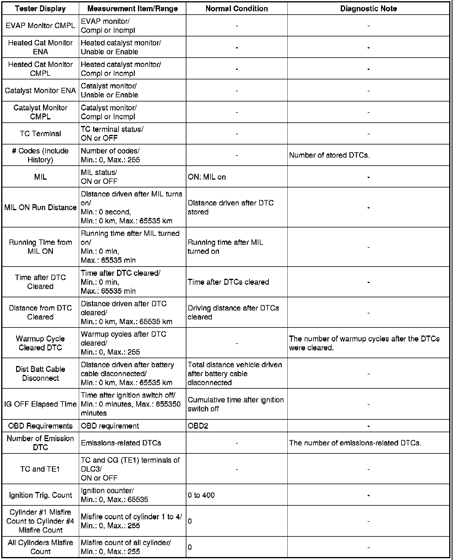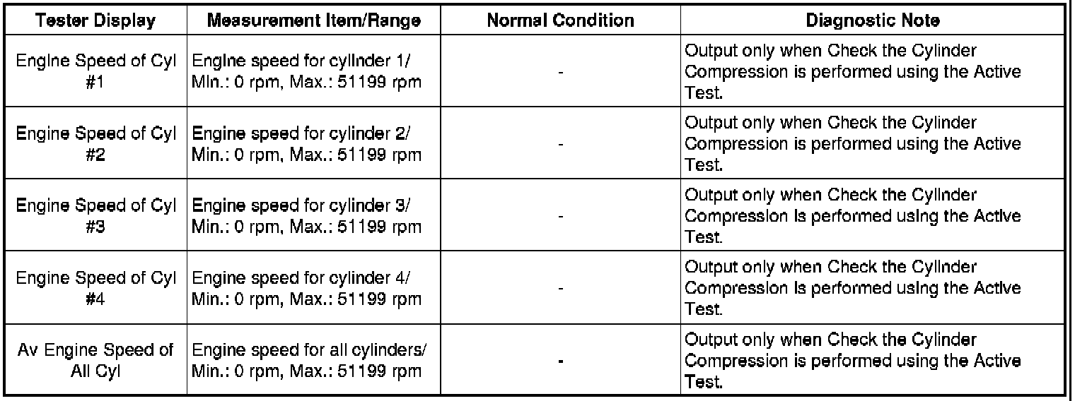 In this Active Test, the fuel and ignition of all cylinders is cut and cranking occurs for approximately 10 seconds. At this time, the speed of each cylinder is measured. If the speed of one cylinder is more than the other cylinders, it can be determined that the compression pressure of that cylinder is lower than the other cylinders.